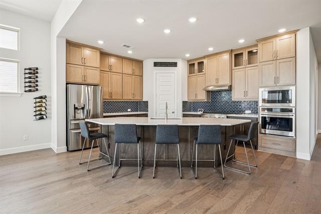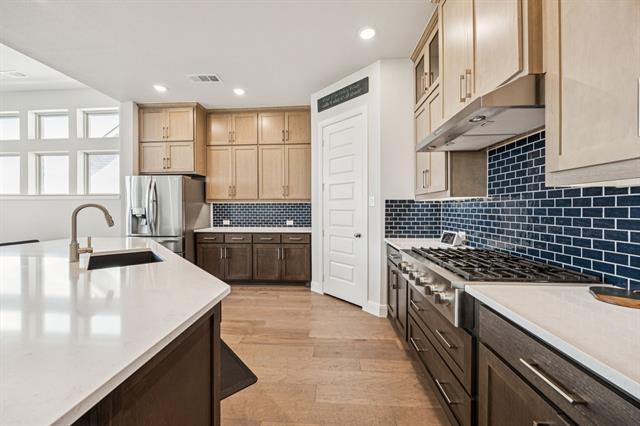 Available for lease — this lightly lived-in David Weekley Pemshore plan sits on an oversized corner lot directly across from the community pool, sand volleyball, and basketball courts. This 4-bed, 3-bath home offers a spacious open layout with 12’ ceilings in the family, dining, and primary bedroom, plus 8’ interior doors throughout. The upgraded kitchen features a GE natural gas rangetop, stacked GE Café oven and microwave, built-in Café dishwasher, quartz countertops, stacked cabinets with clear glass, under-cabinet lighting, pot and pan drawers, a wrapped island, and upgraded sink and hardware. Private study with French doors. The primary suite includes an extended sitting area and a bath with a semi-frameless shower, upgraded tile, nickel finishes, quartz counters, and dual sinks. Secondary baths feature upgraded tile to the ceiling, quartz counters, niches, and upgraded hardware. Engineered wood floors run through the main areas, and all bedrooms include upgraded carpet with a moisture-barrier pad. Additional upgrades include a built-in utility counter, upgraded lighting and fixtures, extended covered patio with added walkways, pre-wire for hot tub, upgraded disposal, and an enhanced front door. Backyard offers ample space for play or outdoor living. Zoned for Celina ISD’s new Vasquez Elementary School.