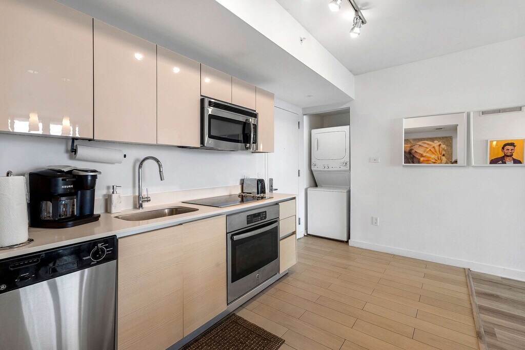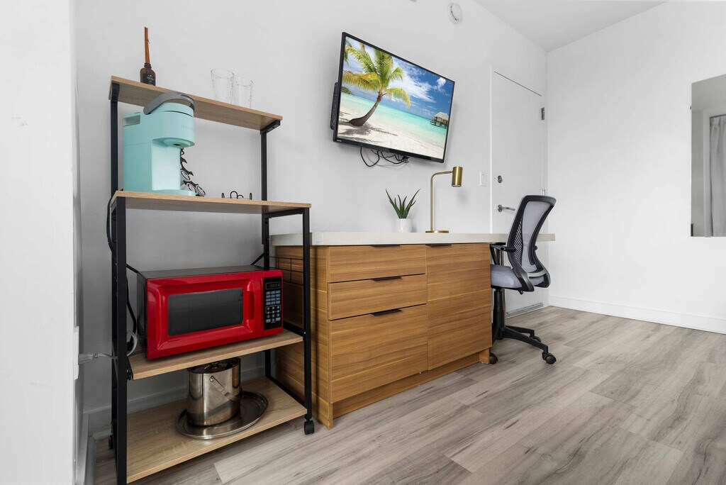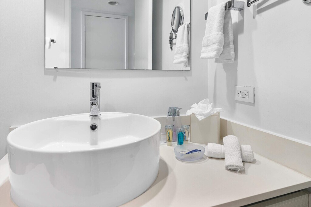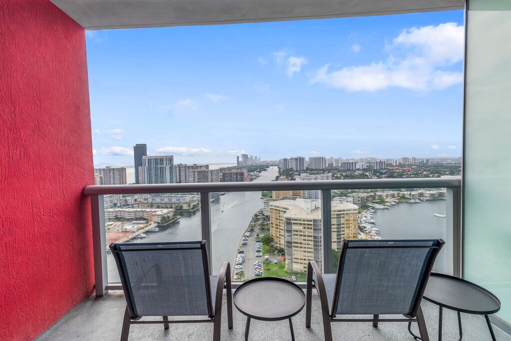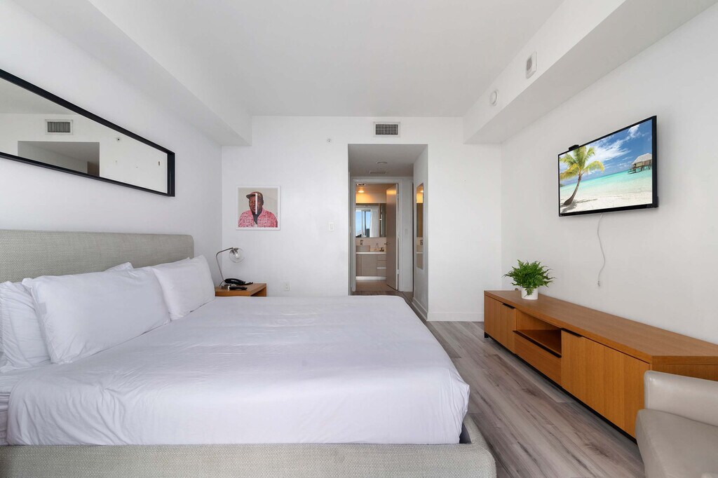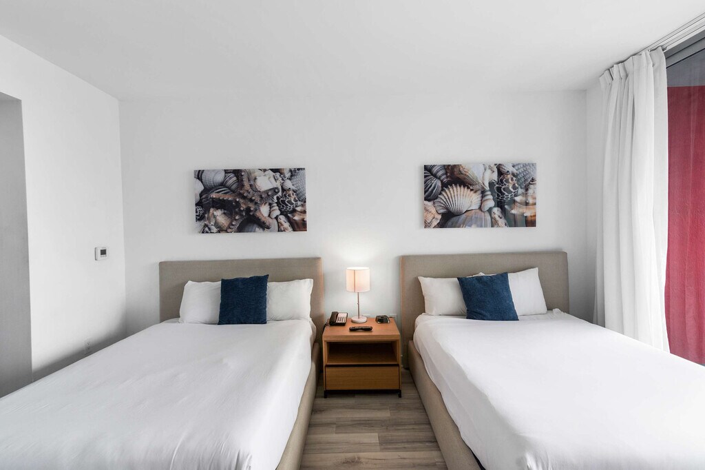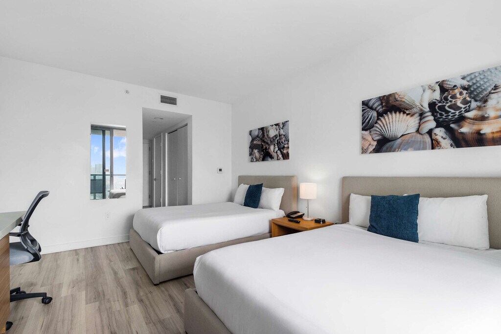 Experience the spectacular Beachwalk Resort apartment, designed by Pininfarina, featuring two bedrooms. The master bedroom includes a king-size bed and a full bathroom, while the second room offers two double beds and a full bathroom. Relax in the living room with a comfortable sofa. Located at the corner of Hallandale Beach Boulevard and the Intracoastal Waterway, this condo-hotel offers resort-style amenities, including a pool, fitness center, and restaurant. Enjoy home comforts with wireless internet and beach access via a free shuttle service, just one block from the beach. A Pack 'N Play crib is available upon request. Valet parking is optional with varying rates depending on the length of stay. Resort fees are charged separately at check-in, with daily rates based on the duration of your stay. Explore the vibrant surroundings with the Hollywood Beach boardwalk and Blue Wave-designated beaches nearby. Discover dining and entertainment at Gulfstream Park, the Hard Rock Guitar Hotel and Casino, and Aventura Mall. The property is conveniently located minutes from Fort Lauderdale Airport, with easy access to Miami Beach and Fort Lauderdale. The gym is currently closed due to ongoing improvements. Smoking is prohibited both inside and outside the premises, with violations resulting in eviction and up to $500 in cleaning charges. Resort fees are mandatory and collected at check-in to complete your reservation. [SI]