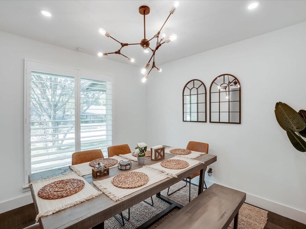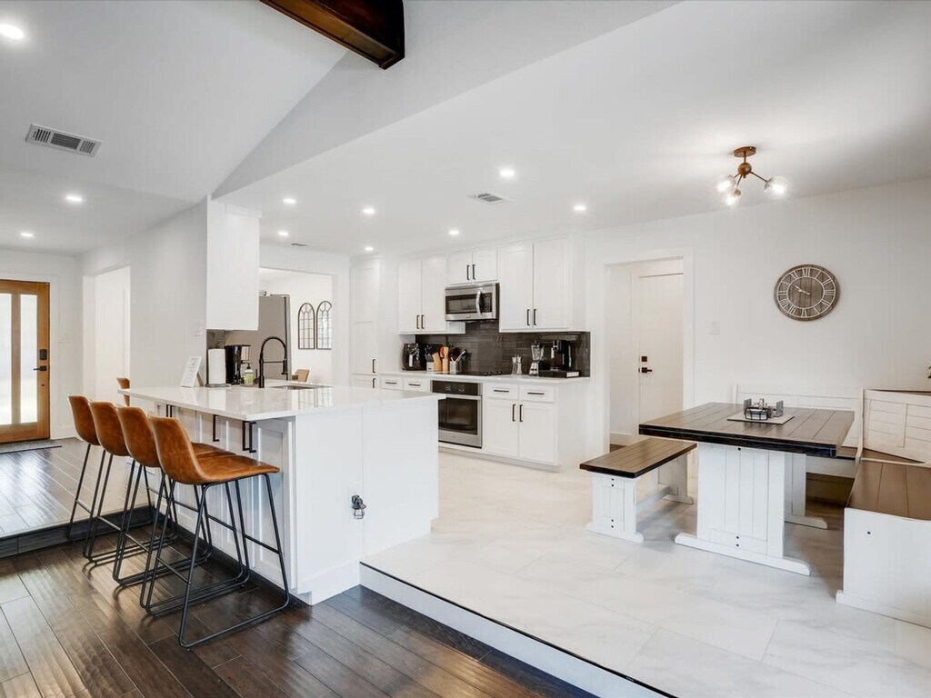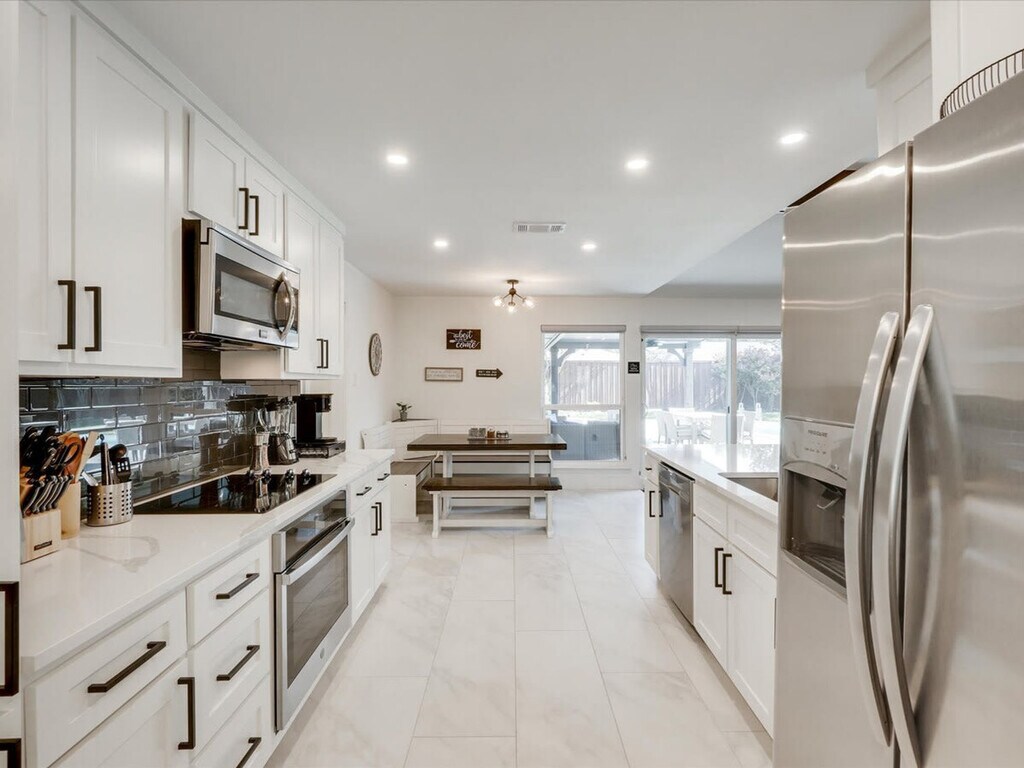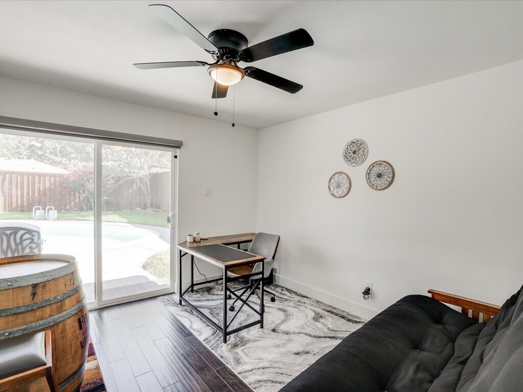 Wow! That's what you'll say when you see this gorgeous, spacious, and tastefully furnished home. Newly renovated with modern finishes throughout, this stunning place features a Texas-sized lot, a backyard oasis with a swimming pool, and a dream kitchen that's sure to impress. With four bedrooms and two bathrooms, this home offers a fully equipped chef's kitchen, a patio, and a grill in the backyard for easy meals, and an outdoor swimming pool. Located in the affluent neighborhood of Caddo Park, this 4-bedroom, 2-bath gem is a must-see. From a top-of-the-line dream kitchen to a backyard oasis, this home caters to both short-term and medium-term stays, making it an excellent choice for corporate housing needs. Whether you're temporarily displaced or require accommodations for your team during an extended project, this property provides a welcoming and comfortable "home away from home" experience. The kitchen is fully equipped with stainless steel appliances, including a fridge, freezer, stove, oven, dishwasher, and microwave. It also includes all basic cooking essentials, a breakfast table, and a breakfast bar with seating for 12. The dining room features a dining table with seat settings for 6+, curated décor, and designer accents for a restaurant-like feel. The living room offers an oversized L-shape couch, a coffee table, a designer rug, aesthetic accents, a flat-screen TV, and high-speed Wi-Fi, all within an open-concept layout for easy socializing. Free parking is included with your stay, with options to park in the garage, on the driveway, or on neighborhood streets. Complimentary laundry is also available with a fully equipped washer and dryer set. Pets are welcome with a non-refundable pet fee of $150 per pet, with a maximum of 2 pets per stay. An additional nightly rate applies for more than 6 guests, with a $29/night fee for each additional guest. Come experience why people love Plano! Known as the most affluent city in the US, Plano offers a high quality of life and is a popular destination for business travelers in the Dallas area. Enjoy nearby attractions such as The Heritage Farmstead Museum, Downtown Plano, The Interurban Railway Museum, The Shops at Legacy, and Arbor Hills Nature Preserve, all within a short drive. For those interested in exploring Dallas, attractions like Adventure Landing Dallas, Vitruvian Park, and Galleria Dallas are also nearby. Smoking of any type is not allowed, with violations subject to a $450 fine plus the cost to clean, deodorize, and repair damages. Check-in is at 4pm and checkout is at 10am. No parties or events are allowed. Pets should be discussed in advance, and only house-trained pets are allowed. Pet cleaning fees apply. A noise alert device is installed to monitor decibel levels and ensure compliance with local noise ordinances. Rest assured, the device does not record or store sound data. The property also features an outdoor security camera facing the backyard entry and covering some of the pool area, ensuring guest safety without infringing on privacy. The fireplace is currently inoperable, and guests are encouraged to bring their own pool towels if desired. All smart TVs are equipped with streaming apps like Netflix, Amazon, and YouTube, and guests are welcome to log in with personal accounts. The office provides a dedicated workspace with a desk, chair, and lighting, and includes a sofa bed for additional sleeping space. This room offers direct access to the backyard, making it a versatile space for both work and relaxation. Registration Number: STR-2605-020 [SI]