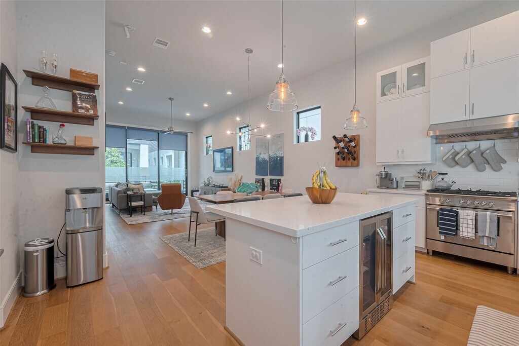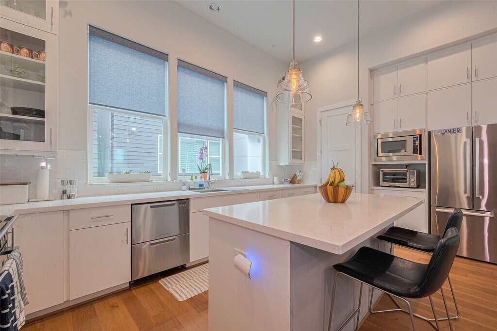 Welcome to the heart of Houston’s vibrant EaDo District. Enjoy the best of urban living with a spacious,modern design,thoughtful updates,and an unbeatable location. Take in courtyard views from your balcony,seamlessly connected to the living room through 10-foot retractable glass sliding doors—perfect for indoor-outdoor living that features soaring ceilings,expansive windows,and a large island kitchen bathed in natural light—ideal for both daily living and entertaining. The generous primary suite offers a walk-in closet and a well-appointed en-suite bath. Upgrades include custom-built-ins in the kitchen and garage,plus a durable epoxy-coated garage floor. Ideally positioned in the community,this home backs to the hike and bike trail and is just blocks from Downtown,the Metro light rail,and East Village’s top restaurants,breweries,and shops. With quick access to major freeways,this is walkable,connected living in one of Houston’s most desirable neighborhoods. MLS# 10115870