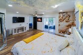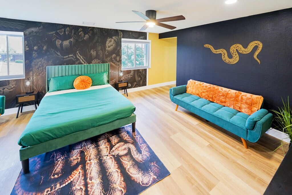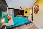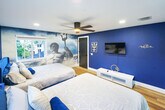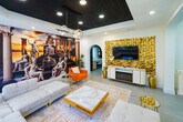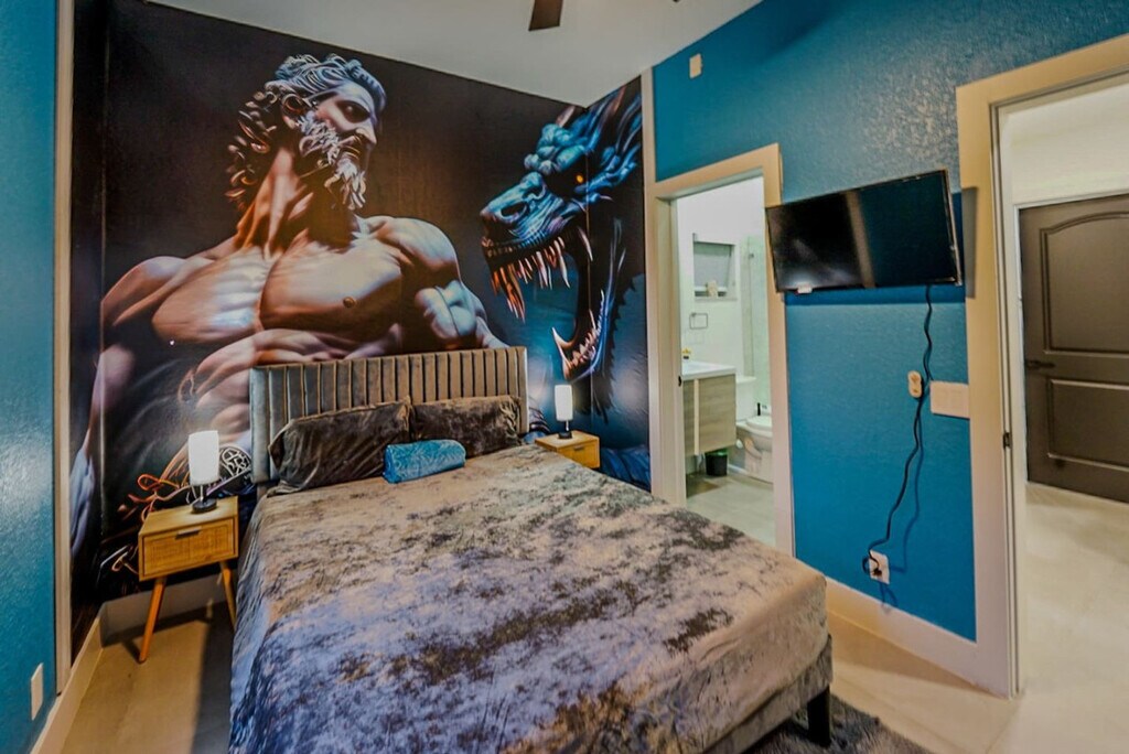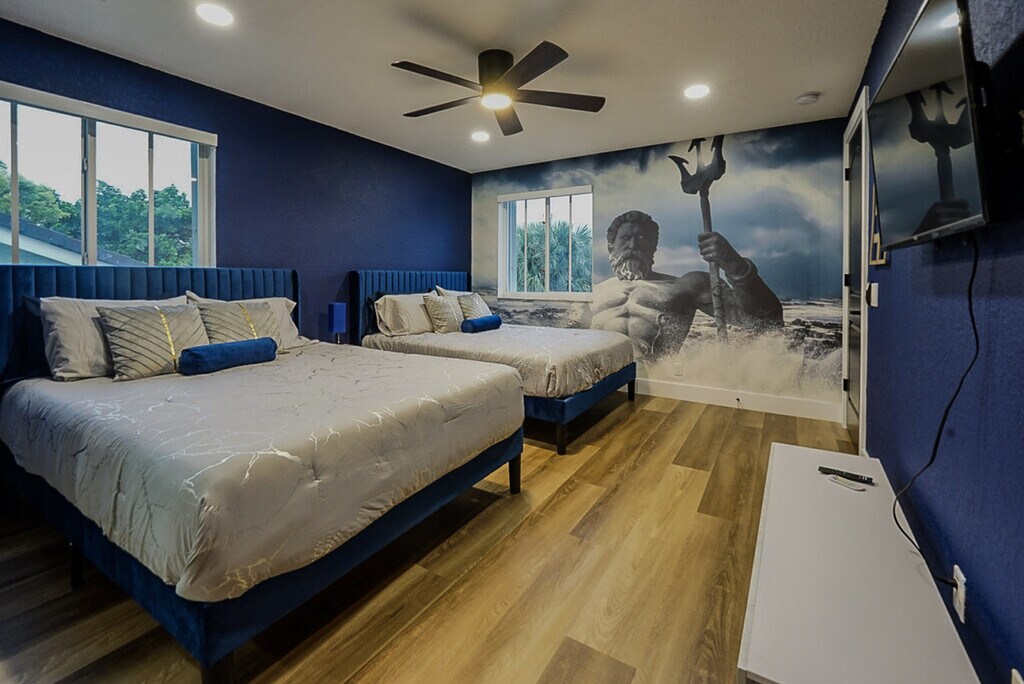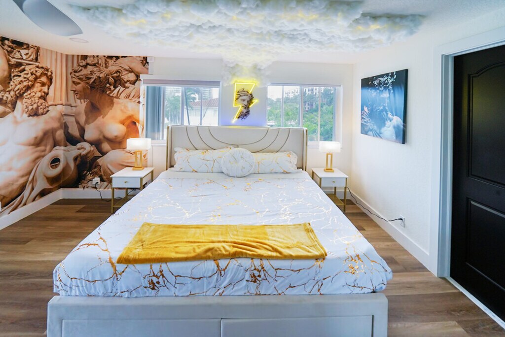 Welcome to this Greek god-themed luxury rental in Las Olas! Feel at home in this one-of-a-kind, newly renovated modern masterpiece, offering 3,400 square feet of opulent living space. This home features 4 lavish en-suite bedrooms and a dedicated workspace. From the moment you enter, you’ll feel as though you’ve stepped into a luxurious Greek palace. The first living area, accented in gold, features an inviting electric fireplace and a spacious couch perfect for large gatherings. The fully equipped kitchen boasts a large island, modern appliances, and everything you need just like at home. The dining area seats six, with additional bar seating for two at the island. Adjacent is the second living area with a sectional couch, large TV, and sliding doors leading to the outdoor patio. The patio features lounge chairs and entertainment options, including a volleyball net, ladder ball, and giant Connect 4, creating the perfect spot for fun. Pets are welcome with a $20 flat fee per night for 1 pet and a $30 flat fee per night for 2 pets. This home is not only a feast for the eyes with its unique Greek God themes, but it’s also filled with modern conveniences and endless entertainment options. Whether you’re lounging by the beach or exploring the vibrant local scene, this home is the ultimate luxury retreat. Smoking is allowed outside on the patio, but there is a $1000 smoke remediation fee for any evidence of smoking inside the home. Quiet hours are from 10pm-8am. There is a $500 pet fine. [SI]