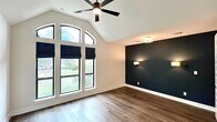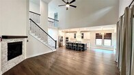 Gorgeous 4-bedroom, 3.5-bath modern farmhouse with standout curb appeal and a spacious tandem 3-car garage. Step inside to a bright, open layout featuring soaring cathedral ceilings, large windows, and luxury vinyl plank flooring throughout the main level. The gourmet eat-in kitchen is the heart of the home, offering quartz countertops, stainless steel appliances, modern pendant lighting, and an oversized island that opens to the family room with a cozy corner fireplace. A formal dining room provides an elegant space for entertaining, while the dedicated home office offers privacy for work or creative projects. The main-floor primary suite is tucked away for true relaxation, complete with generous closet space and a spa-inspired bath featuring a large custom walk-in shower and contemporary finishes. Upstairs includes three secondary bedrooms, a spacious game room, and a separate media room—ideal for movie nights or gaming. Enjoy a large covered back porch, mature trees, and fantastic community amenities including a pool, pickleball courts, fishing pond, dog park, and playground. Conveniently located near I-35, shopping, and dining.