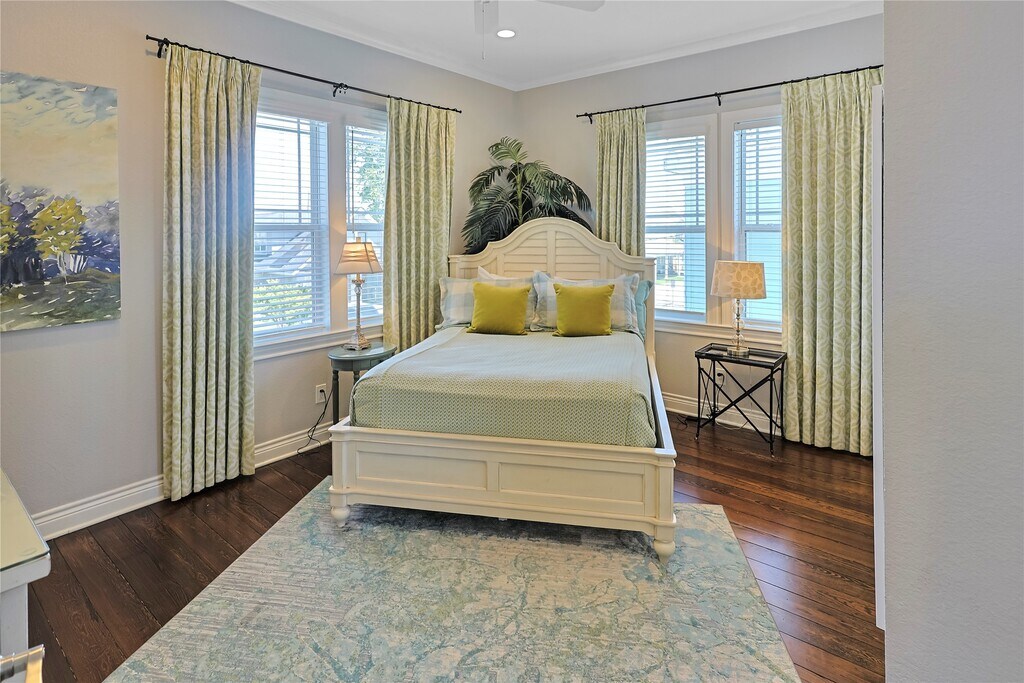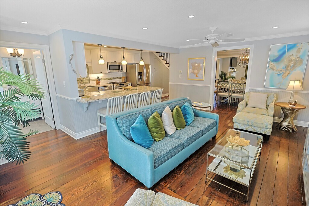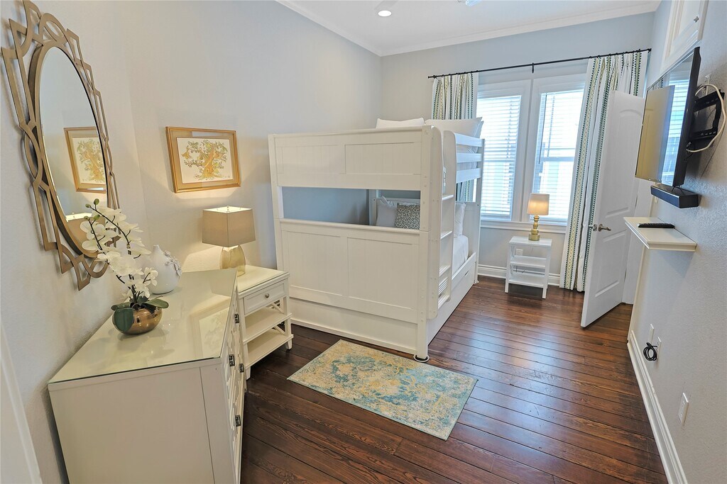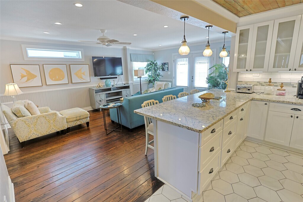 Step into coastal charm! This updated 3-bedroom,2.5-bath home in the heart of Galveston Island is thoughtfully designed and features beautiful wood flooring,wainscoting,and custom finishes that add character and style throughout. The kitchen includes a large island with breakfast-bar seating,a unique wooden ceiling,and stainless steel appliances: gas-range stove,dishwasher,microwave,and refrigerator. A tiled half bath adds main-floor convenience,while a shiplap-style wall in the formal dining room connects the open-concept living area to a cozy formal den. Upstairs,the spacious primary suite offers a private balcony and spa-like ensuite. The front guest room is filled with natural light and features a roomy closet,while the third bedroom is set up with full bunk beds. A tiled full bath and dedicated laundry room complete the second floor. With custom touches and a smart layout,this home blends comfort and charm—just blocks from the beach,restaurants,and shops. MLS# 41755880