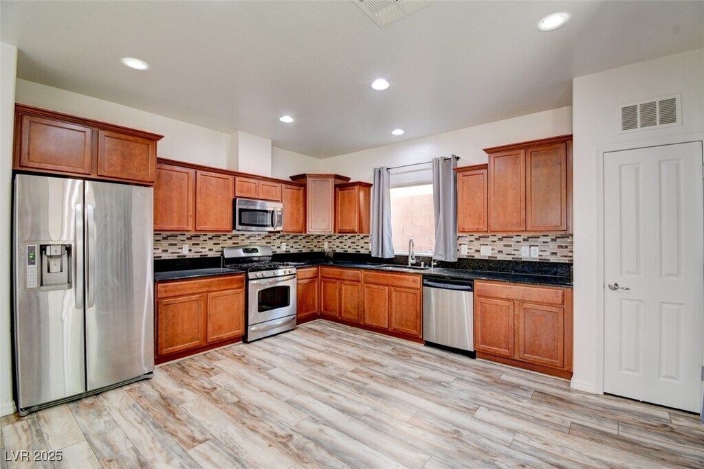 Freshly painted with brand-new carpet throughout, this spacious two-story home offers three bedrooms, 2.5 baths, a huge loft, and a downstairs den that can serve as a 4th bedroom or home office. The inviting kitchen features granite countertops, upgraded cabinetry, stainless steel appliances, and a large pantry. Perfect for family cooking and entertaining. Enjoy the open-concept living area with beautiful luxury vinyl plank flooring and plenty of natural light. The primary suite includes a separate tub and shower and a walk-in closet. The laundry room is conveniently located upstairs. Relax outdoors in a low-maintenance backyard with artificial turf, a stone paver patio, and mature landscaping. Located near parks, top-rated schools, and scenic walking trails, this home combines comfort, style, and an unbeatable Henderson location!
