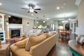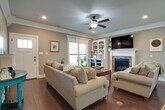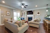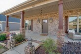 This charming home features an open floor plan with window coverings throughout. The spacious kitchen offers granite countertops, stainless steel appliances, and a farmhouse sink. The living room includes wood floors, a gas fireplace, and built-ins, creating a cozy and welcoming space. The primary suite boasts wood floors, a tray ceiling, walk-in closet, and private bath with dual vanity and walk-in shower. Two additional bedrooms feature comfortable carpeting and ample closet space. Enjoy outdoor living with a covered front porch, covered rear porch, and privacy-fenced backyard. A huge side entry, two-car attached garage plus a large floored storage area above the garage provide plenty of storage and convenience.