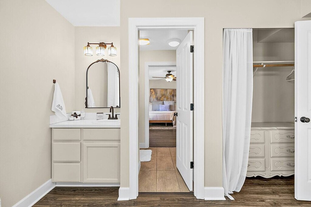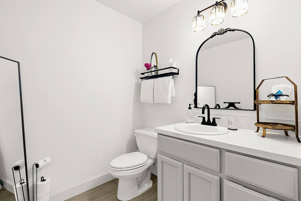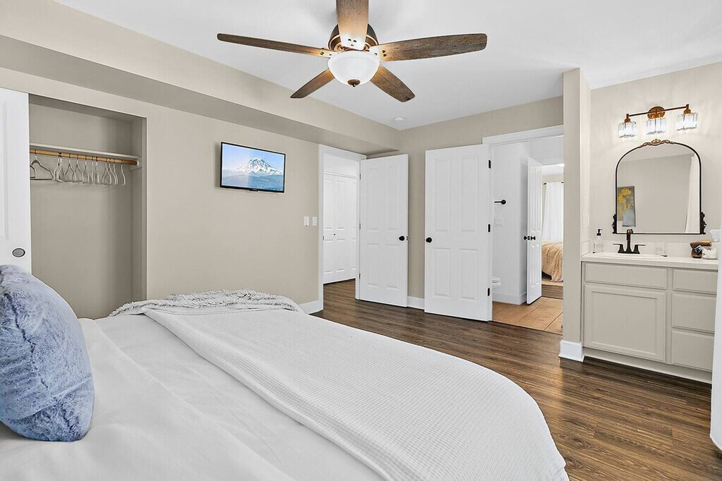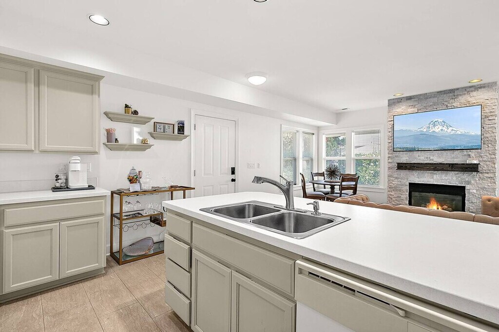 This private 2-bedroom, 1.5-bath condo is nestled on a quiet dead-end street in the heart of Old Town Tacoma, just 3 blocks from the waterfront. Whether you're traveling with friends, family, or coworkers, this space is perfect for short-term stays that need privacy, convenience, and views. Both bedrooms offer plush king-size beds, stylish decor, and their own personal vanity spaces for added privacy and comfort. A shared full bathroom with a walk-in shower connects both suites, plus there's a separate half-bath off the living area. The fully equipped kitchen allows you to cook meals with ease, complemented by open-concept living with dining for four and a cozy gas fireplace beneath the 55" Smart TV. Enjoy your own patio for morning coffee, and access the massive shared rooftop-style terrace with a gas BBQ, lounge seating for 10, and views of Commencement Bay. Stay fresh with in-unit laundry and enjoy 2 parking spots: 1 garage and 1 off-street space. One garage space and one additional off-street parking space are available for use. Stroll cobblestone streets, visit Job Carr Cabin Museum, sip coffee, or dine waterfront – all within walking distance. This is Tacoma's most historic and charming district, where cozy meets cool. Minutes to Ruston Way and Downtown. This is an independent condo within a large home. There is one condo upstairs and one directly next door. Enjoy fast WiFi and easy self-check-in. [SI]
