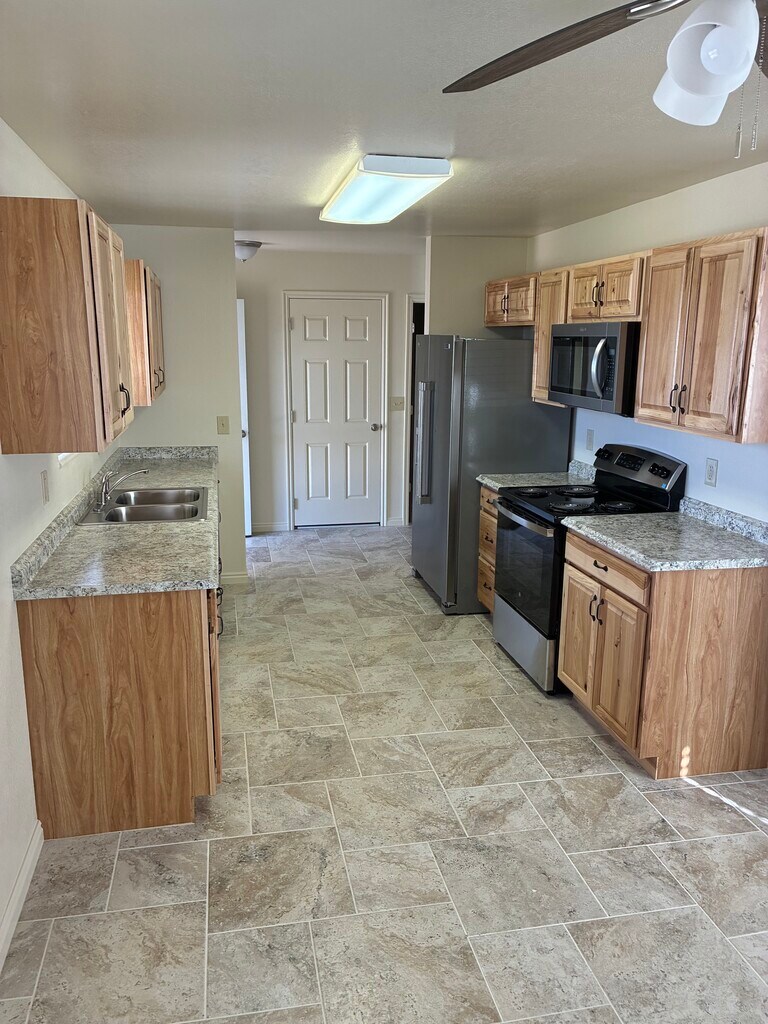 Remodeling just complete. New cabinets, new sinks, new faucets, new appliances, new tub, new tile, new furnace, new carpet, new paint, new blinds. Single car garage with opener, fenced rear yard with sprinkler system, front and rear patio. Come take a look. Text or call Charlie at for all details. I offer a senior discount and prefer long term renters and seniors.