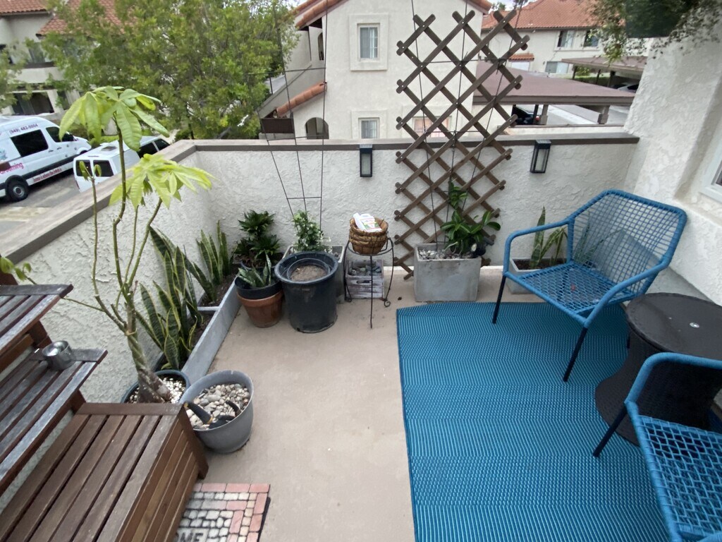 Welcome to this charming 1-bedroom, 1-bath condo located in the desirable Las Palmas community. This beautifully upgraded, upper-level end unit features 513 sq ft of efficient indoor living, complemented by a private balcony perfect for relaxing outdoors, enjoying fresh air, or entertaining guests. Enjoy modern features such as keyless entry, triple-pane windows, recessed lighting with Alexa smart capability, and a tankless water heater. The home includes a washer and dryer, refrigerator, over-the-range microwave, electric stove, dishwasher, and a whole-house 3-stage water filtration system. A new 2-ton A/C compressor with heat pump ensures year-round comfort. The updated kitchen is equipped with new appliances, countertops, and soft close cabinets, opening to a bright living room. The spacious bedroom features a remodeled bath with new vanity, cabinet, and counters. Your unit sits directly above your one-car garage, with additional street parking available. Water, trash, and sewer are included in the rent. Residents enjoy access to two community pools, a spa, and membership to Lake Mission Viejo, offering boat rentals, water sports, picnic areas, and entertainment events. The location is convenient to shopping, dining, parks, schools, freeways, and scenic trails. Schedule a viewing today to make this inviting condo your new home!