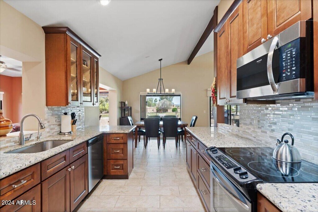 Located on the 6th hole of the Quail Run golf course w/ spectacular panoramic mountain views,this Rio Verde Country Club home is your next vacation destination! This stunningly remodeled energy efficient home boasts a wide-open floorplan,gorgeously appointed kitchen,elegant bathrooms w/ jet tub in the primary,soaring ceiling & fireplace in the great room,& family room w/ kitchen pass-thru & gas fireplace. The vast east facing resort style covered patio includes built-in flat screen,commercial heaters,Weber BBQ & multiple seating areas to absorb the majesty of our desert landscape & mountain scenery. The inviting covered front patio has quaint seating areas & access to the tiled 2 car garage. Multiple community amenities & activities available! Relax & recharge in this amazing home!