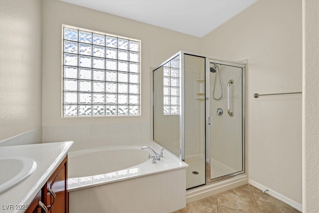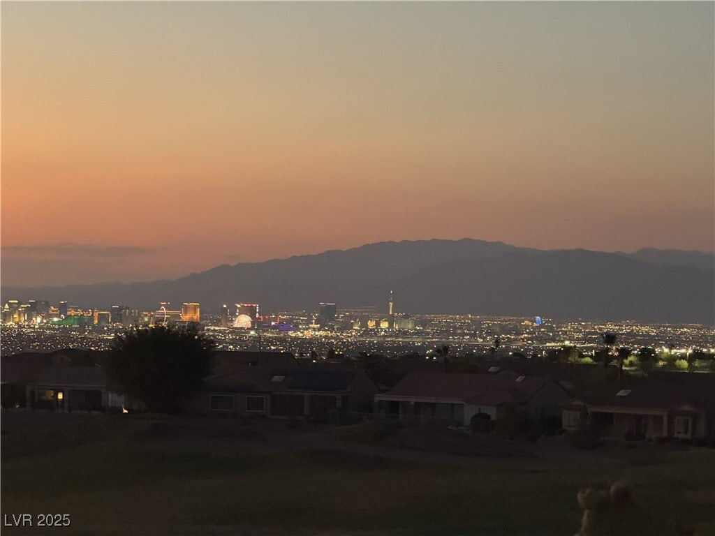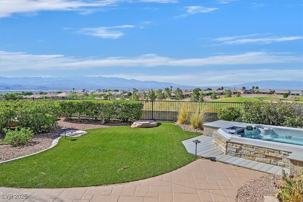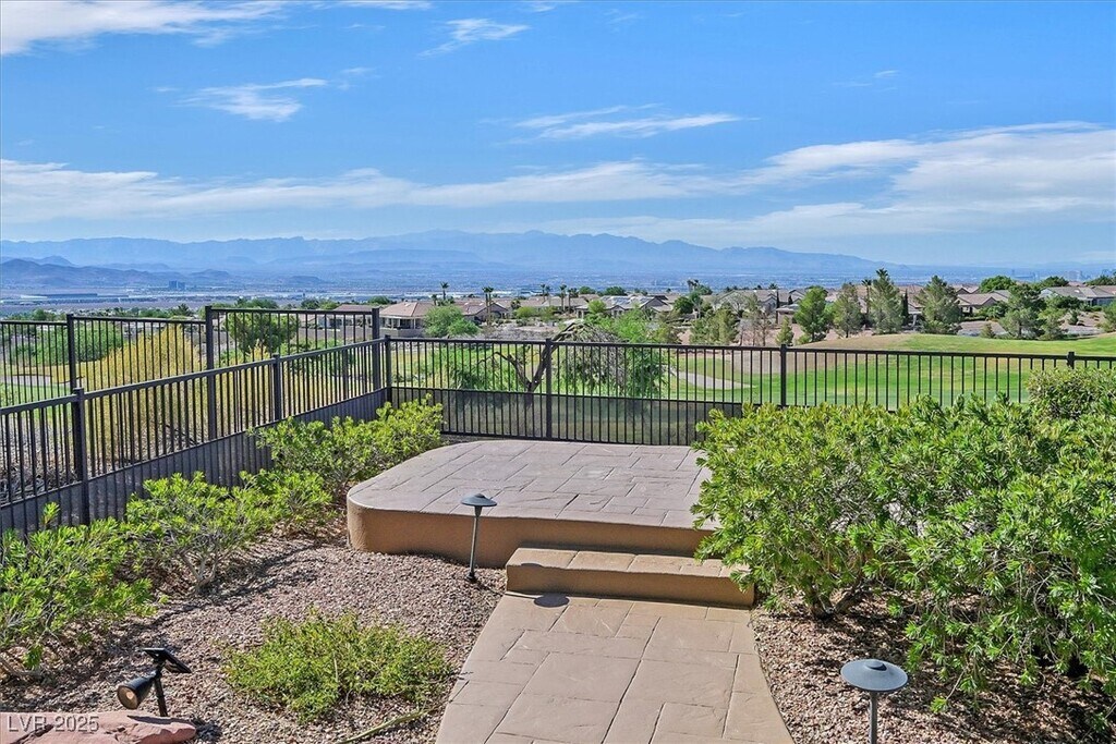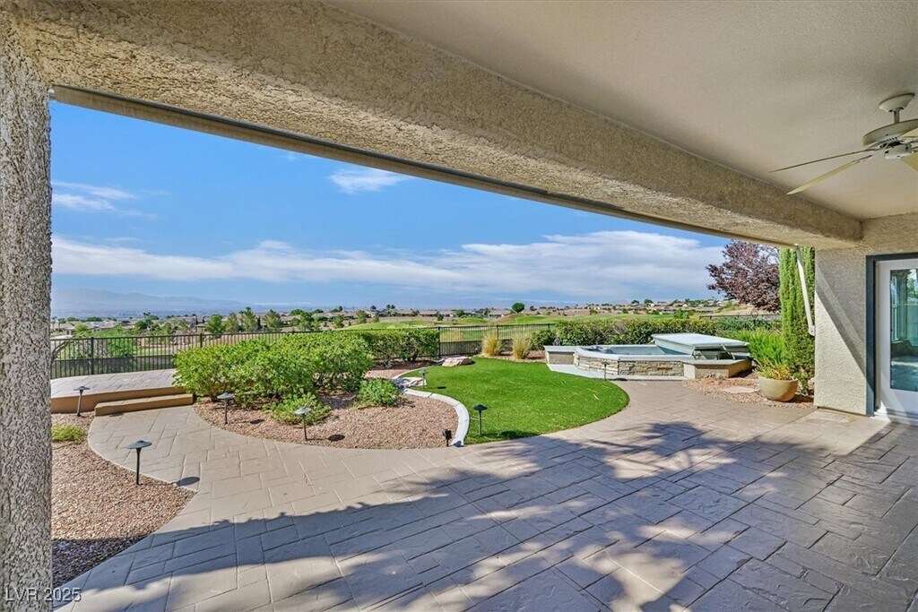 Welcome to the home with an enchanted view of the strip, golf course, and the lake! The fantastic view is worth visiting this beautiful home in Sun City Anthem. Highly upgraded, fenced, spa, electronic shade in the backyard, and an elevated platform for viewing the magnificent sight. Enjoy your private spa in the backyard while taking in the beautiful view on the horizon, including the golf course, strip, and the lake. All the perks are here. Clean, sparkling kitchen, paved driveway, bamboo flooring, view from the living room, kitchen, bedroom, epoxy painted garage and freshly painted living room. All rooms have ceiling fans. Pendant lights over the kitchen counter. Pantry galore.