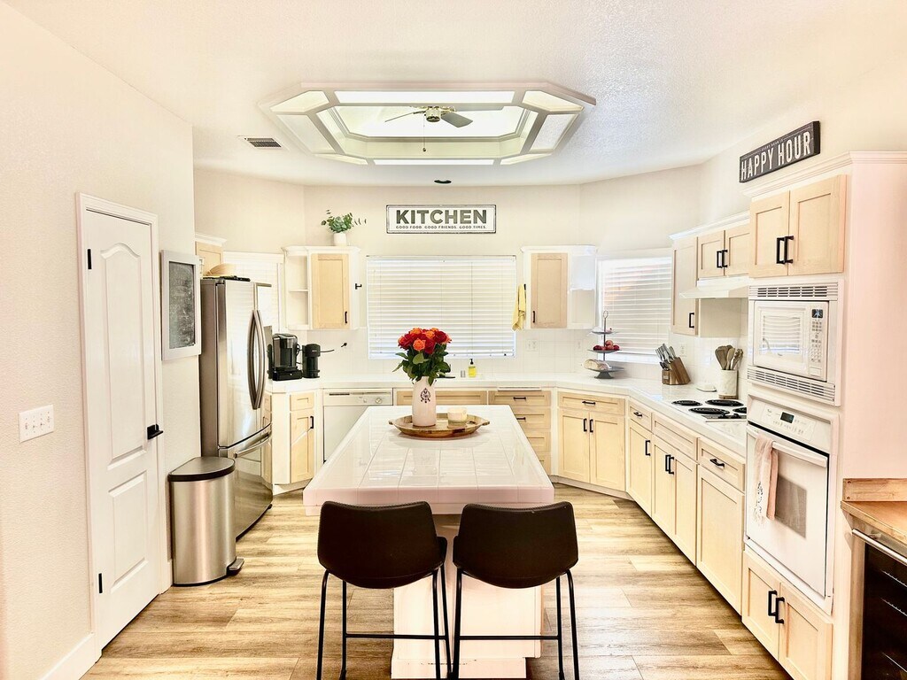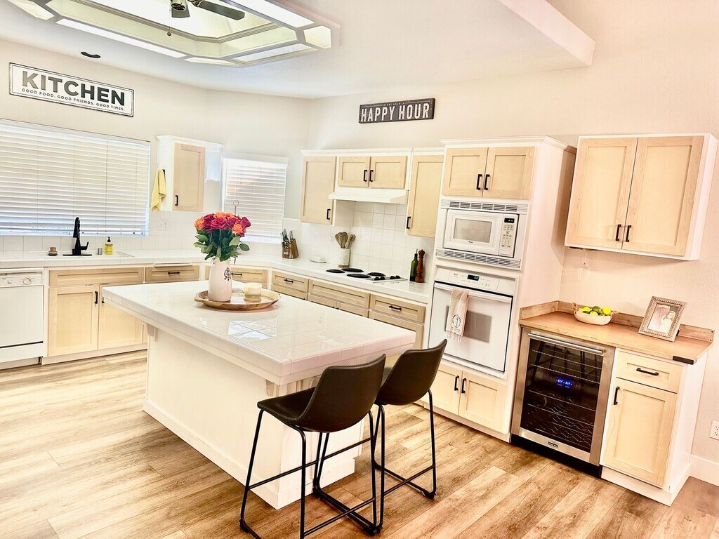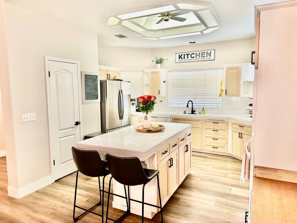 Beautifully updated 3-bed 2 bath home in quiet, family friendly neighborhood in North Fresno/Woodward Park area. This home offers an open floor plan with vaulted ceilings and lots of natural lighting. The kitchen includes large center island and offers ample storage space along with high-end appliances and additional coffee bar and wine fridge. New shaker cabinets doors and hardware have just been installed and all cabinets will be painted white before the lease begins. All bedrooms are incredibly spacious and master bedroom includes en-suite with walk-in closet, spa-like bathroom with double sink vanity and large soaker tub, and private backyard access. Both, front and back yard are nicely landscaped (gardener included with rent) and both offer a covered patio space. Additional amenities include indoor laundry with washer/dryer included, 3 car garage, and solar panels to cut down on the high energy expenses (tenant responsible to pay monthly solar lease). Property is also located within award winning Clovis Unitfied School District. Call now to schedule a private tour!