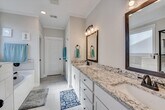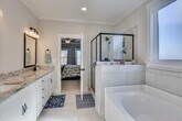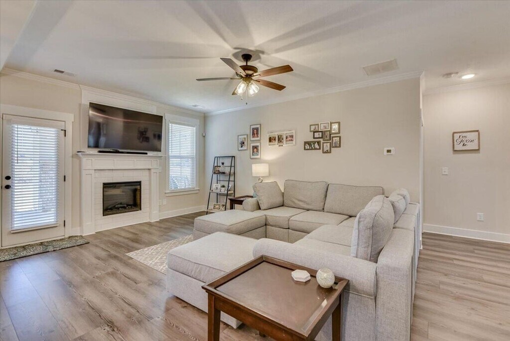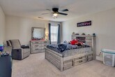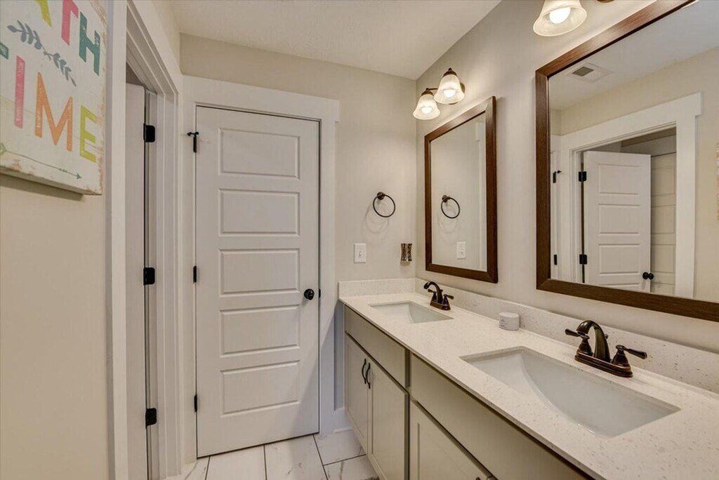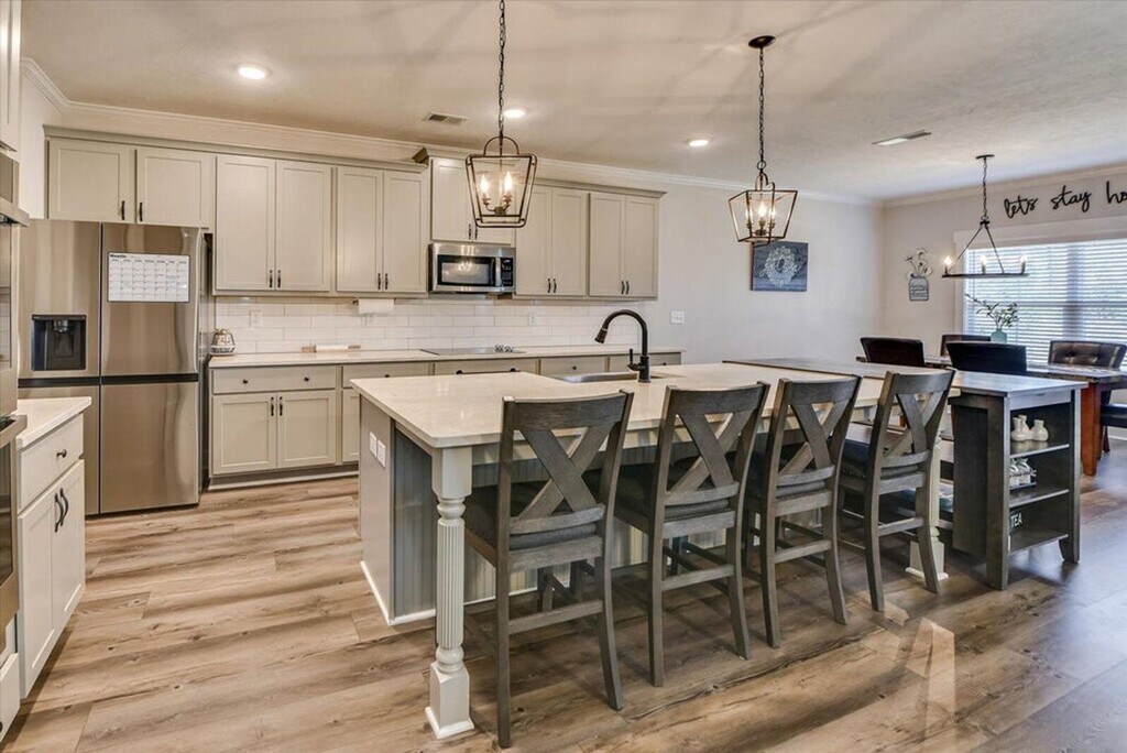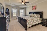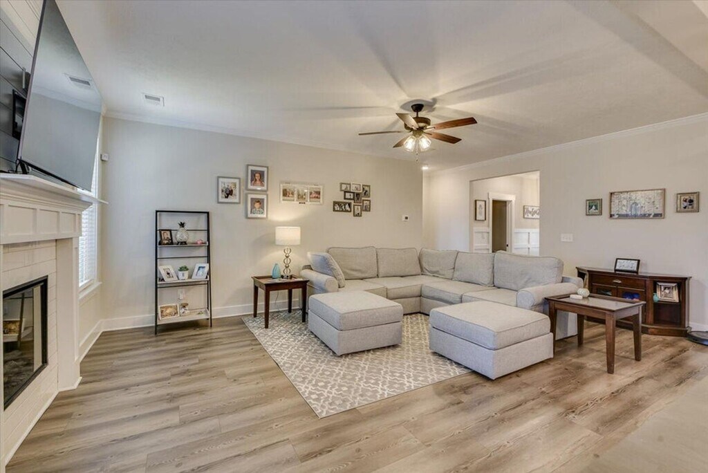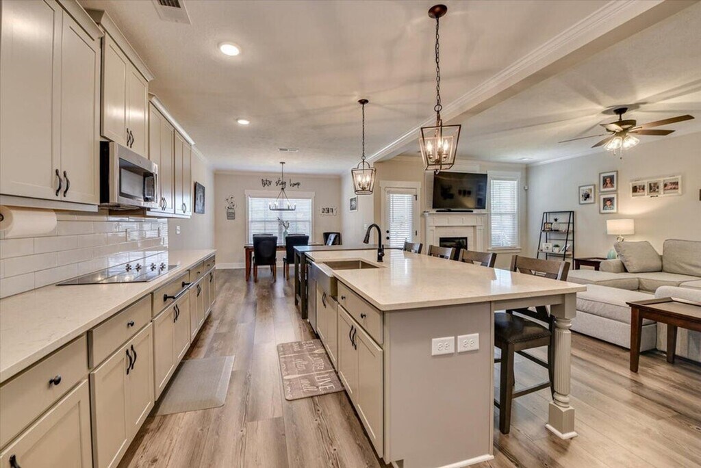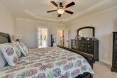 Introducing the stunning Sable Plan by South GA Homes, a rare gem boasting 5 bedrooms and 3.5 bathrooms. This home is designed to impress, featuring a spacious owner's suite conveniently located on the main floor. From the moment you lay eyes on the exterior, with its charming board and batten farmhouse accents, covered front porch, and a covered back porch complete with a wood-burning fireplace, you'll be captivated. Step inside to a grand 2-story foyer/entryway that leads to an open floor plan, perfect for family living. The large kitchen is a chef's dream, complete with a kitchen island featuring a farmhouse sink, upgraded quartz countertops, a stylish tile backsplash, double wall oven, a generously sized pantry, and a dining room adorned with a ship lap accent wall. The main level also includes a laundry room for added convenience. The owner's suite on the main floor is a sanctuary of luxury, featuring a separate garden tub with a tile surround, a full tile shower, double vanities with a granite countertop, a private toilet closet, upgraded tile flooring, and a spacious walk-in closet to store your wardrobe essentials. Upstairs, you'll find three additional bedrooms, with a versatile 4th bedroom/office room option complete with charming barn doors. One of the bedrooms boasts a full private bath, while a second full hall bath caters to the rest of the household. Additional features of this home include a sprinkler system, 30-year architectural shingles, and the disclaimer that all decorative items are subject to change based on availability.