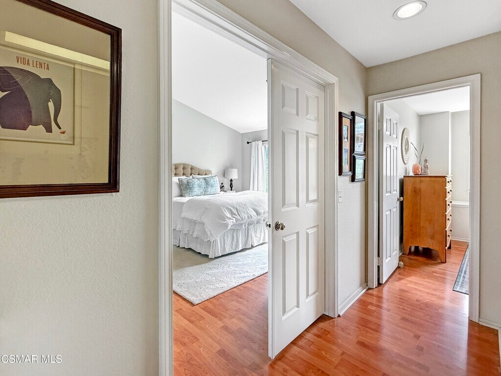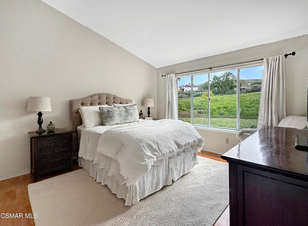 Exquisite Wood Ranch location second floor unit with vaulted ceilings and amazing views! Located behind secure gates, this private community is superbly located adjacent to the Wood Ranch Golf Club, Park, and lake. The community features a community pool and spa. This is an upstairs end unit with windows everywhere bringing in tons of wonderful light. Enjoy your morning cafe on the patio watching the sunrise over beautiful mountains or wine down the day as you look over the beautiful oak trees behind you. The home features an attached two car garage with direct access via an interior stairway. A huge storage loft is conveniently located at the top of the stairs. The kitchen is spacious and features a breakfast area. A formal dining room is perfect for entertaining and also features a wet bar. Relax and unwind in the living room complete with a cozy fireplace. An additional room is perfect for a den or home office. The primary bedroom has vaulted ceilings and its own en-suite bathroom. The bathroom features a tub/shower combo, dual sinks, and walk-in closet. The second bedroom has a wonderful view of the natural landscaping behind the home. You will love living in this home and the location!