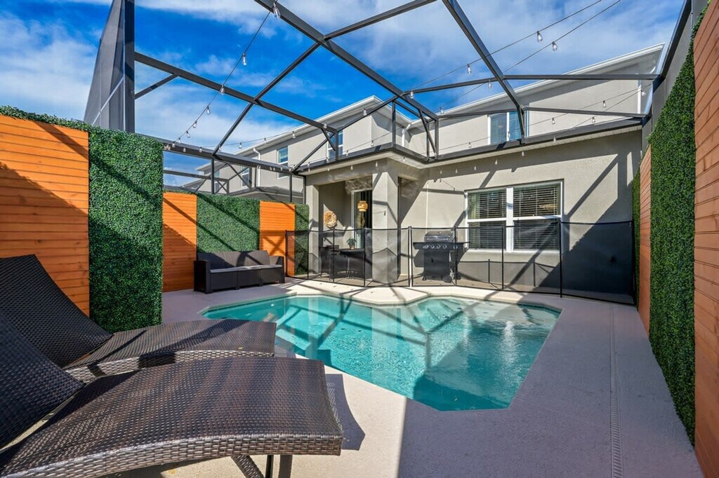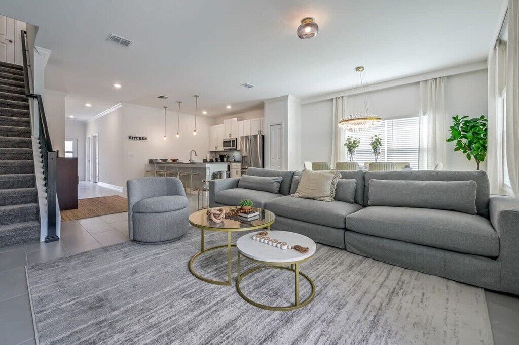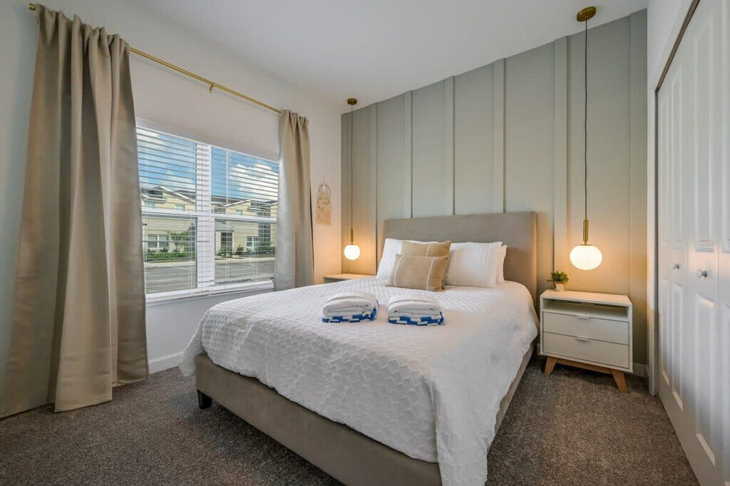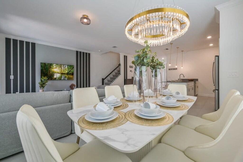 Immerse yourself in luxury and fun at this splendid 5-bedroom townhome. Marvel at the enchanting Frozen and Harry Potter-themed bedrooms and indulge in endless joy at the amazing private pool area. The pool is not just a pool, it's a beautiful oasis where you'll have a blast. Dive in for a refreshing swim or unwind by the poolside. Plus, the resort's clubhouse offers a plethora of recreational activities. For added excitement, explore the nearby Disney Theme Parks, stores, and restaurants, all just minutes away. Create magical memories with your loved ones that will last a lifetime. Step into the lap of luxury at this exquisitely decorated villa designed to accommodate up to 12 guests. As you enter, you'll be greeted by a spacious living room seamlessly connected to the dining area and fully equipped kitchen, creating an ideal entertainment space. The kitchen boasts all the essential amenities for cooking and dining convenience. Outside, prepare to be enchanted by the amazing private heatable pool area—a true oasis of fun and beauty. This property features 5 bedrooms spanning two floors. On the first floor, a charming bedroom with a queen bed and a Frozen-themed bedroom with one double bed and one single bed share a well-appointed bathroom. Upstairs, indulge in the luxury of two king suites and a Harry Potter-themed bedroom featuring one double bed and one single bed, complete with its private bathroom. In addition to the splendid bedrooms and entertainment spaces, guests can enjoy complimentary amenities such as free Wi-Fi, convenient parking, and a dedicated laundry area furnished with a washer and dryer. A thoughtful welcome package awaits, providing basic bathroom and kitchen supplies for your comfort. Heating the pool is a paid service and there is also a fee charged to use the barbecue grill. Storey Lake Resort has the perfect location just 10 minutes from all major attractions and theme parks in Orlando, including Walt Disney World, Universal Resort, and Sea World. You will find fantastic resort amenities for the whole family to enjoy with a tiki bar, a resort-style pool with slides and lazy river, sports court, mini-golf, kayak, and fitness center. There are two clubs inside the property, one of them with a themed pirate pool that kids will love, just walking distance from the house. Located just off Osceola Parkway, the resort has easy access to restaurants, shopping, and supermarkets, all within a 5-minute drive. Quiet hours are between 22:00 and 8:00. Replenishment of bathroom and kitchen amenities is the guest's responsibility. [SI]