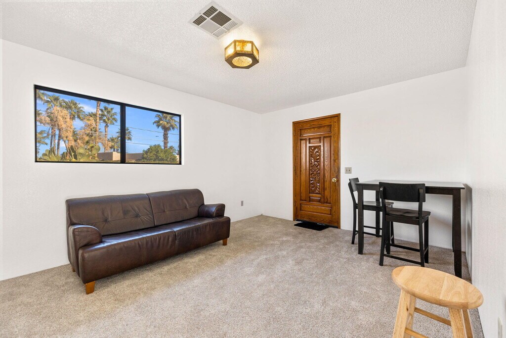 Welcome to your desert oasis! Tranquil,serene,and supremely private,this Palm Springs retreat is a genuine hideaway. Set on a nearly ¾-acre lot flush with smoke trees and sublime mountain views from every angle,the property features two bedrooms and two baths in the main house,plus a detached two-room,one-bath casitaideal for guests,a home office,or a creative studio. The spacious primary suite includes a versatile bonus area that's perfect for a home office,reading nook,or private loungean ideal setup for a quiet live/work lifestyle. Built in 1983 and thoughtfully maintained,the home retains much of its original character,with vintage detailingfloor-to-ceiling stone-and-brick fireplace,beamed ceilings,and colorful tileworkadding touches of charm throughout. In-unit laundry,an expansive driveway,and a carport with space for two vehicles provide additional comfort and convenience. Nestled on a quiet street in the coveted Araby Commons neighborhood,you'll enjoy peaceful surroundings just minutes from shops,restaurants,museums,and all the best that Palm Springs has to offer. Whether you're seeking a quiet full-time residence or a long-term desert escape,2645 Anza Trail is the perfect blend of privacy,space,and serenity. See more -