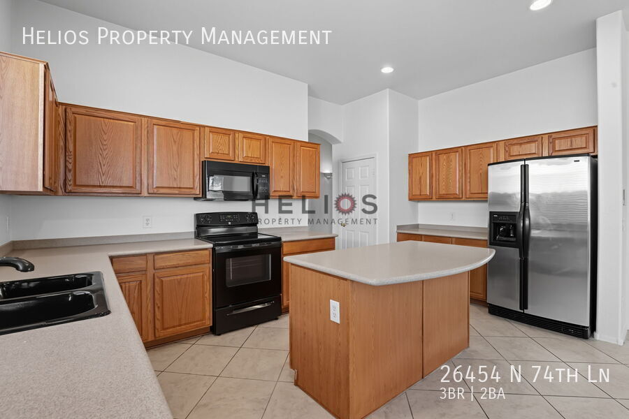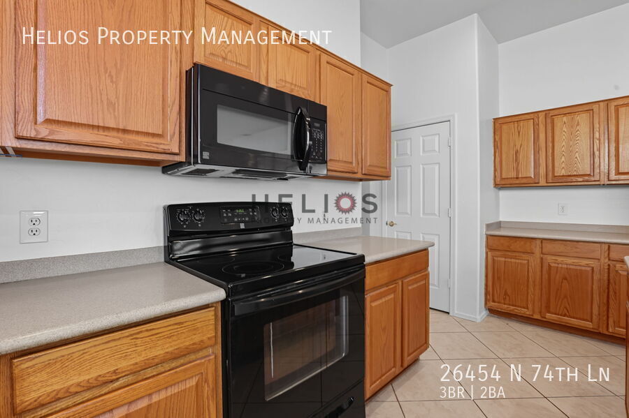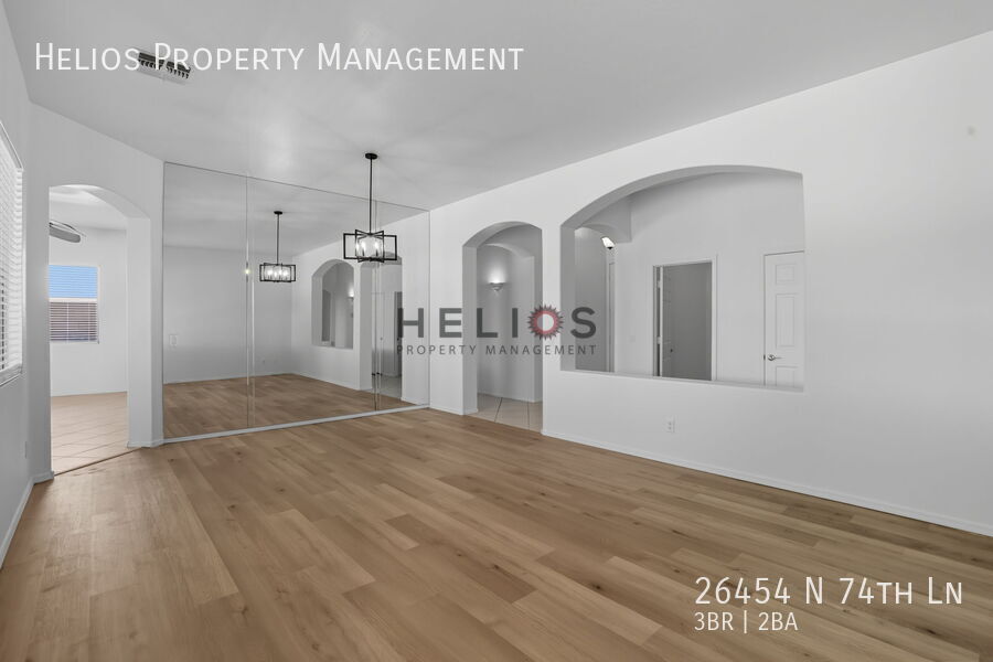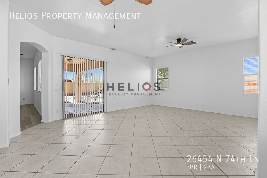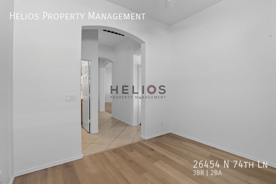 $500 off of your First Month's Rent! Welcome to 26454 N 74th Lane, where sophistication meets wide open spaces in this remarkably spacious three-bedroom residence. Only 15 minutes from Lake Pleasant, and designed with scale and comfort in mind, every room in this home offers a sense of openness that is increasingly rare. The flowing floor plan highlights a large great room and a kitchen made for both everyday living and entertaining. With an oversized island, abundant counter space, and extensive cabinetry, the kitchen anchors the home and connects seamlessly to the expansive living and dining areas. High ceilings and generous proportions throughout enhance the sense of volume and light. Newly painted and new wood floors! The primary suite is a retreat in every sense a true sanctuary with a substantial bedroom, spa-inspired bath featuring dual vanities, soaking jacuzzi tub, walk-in shower, and an expansive walk-in closet. The secondary bedrooms are equally impressive in size, offering the flexibility to accommodate guests or family. In addition, there is a great den that can be used as an office space and a grand room looking out onto the massive yard. Outdoors, the oversized backyard (a rare find!) provides a blank canvas with mature trees, view-fence of the desert mountain sunsets, and a covered patio ideal for gatherings. A three-car EXTRA LONG garage fits multiple big cab trucks and an RV gate that ensures storage and convenience for vehicles, boats, or recreational gear. Set in a desirable Peoria community with access to greenbelts, parks, and playgrounds, this home combines the freedom of generous space with the sophistication of modern desert living and quick access to boating, fishing, and more. $2395.00 per month rent, $2395.00 Refundable Security Deposit, $200 Admin Fee, $300 per pet Non-Refundable Pet Fee (per approved pet), $50 per pet Monthly Pet Rent (per approved pet dog), $100 per pet monthly pet rent (per approved pet cat). $29 per month Energy and Preventive Maintenance program. Facts and figures are provided to the best of Helios Property Management's ability but are not guaranteed to be accurate. You are encouraged to verify any fact or figure materially relevant to you and your decision to rent this home. The Landlord requires coverage of $100,000 of liability coverage per the lease agreement. This requirement can be fulfilled by either a Renters Insurance policy or a Tenant Liability policy. Move in special is with immediate occupancy and well qualified applicants only.