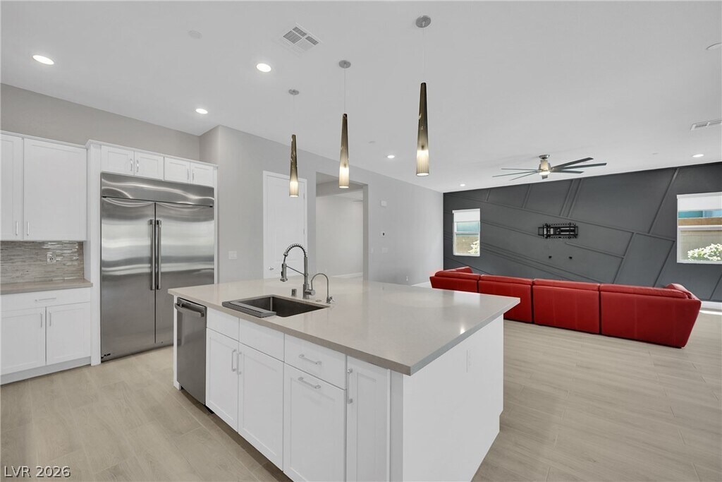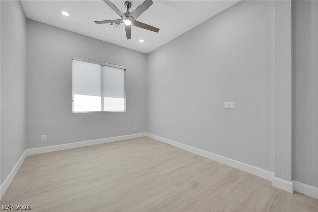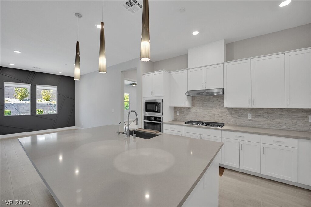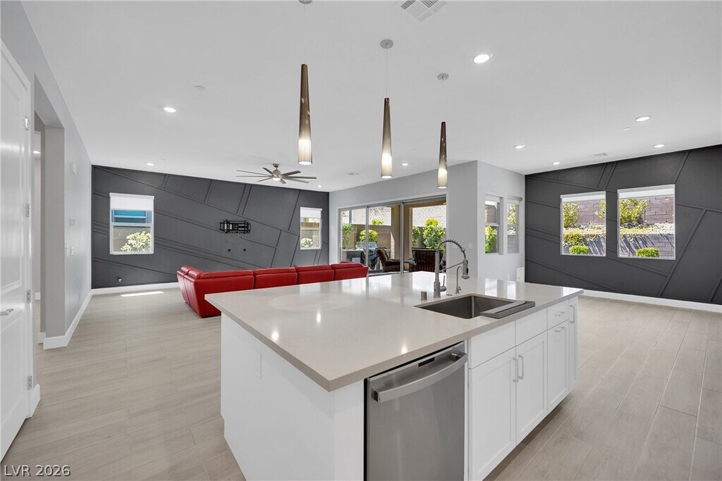 Summerlin's Newest Community Redpoint Village! This stunning single-story residence, boasts 4 bedrooms, 4 bathrooms, an office space, and a very private backyard. As you enter, the open-concept design welcomes you into a spacious living area, perfect for entertaining. The heart of the home is the gourmet kitchen, equipped with modern appliances and a center island that overlooks the outdoor entertaining area with a 3-panel slider for indoor/outdoor living. Modern fixtures, ceiling fans, shutters, water filtration. Step outside, and you'll find a backyard oasis. The covered patio serves as an extension of the living space, offering a shaded retreat for outdoor dining or lounging. The pristine pool invites you to cool off on warm days. MLS ID 2776044
