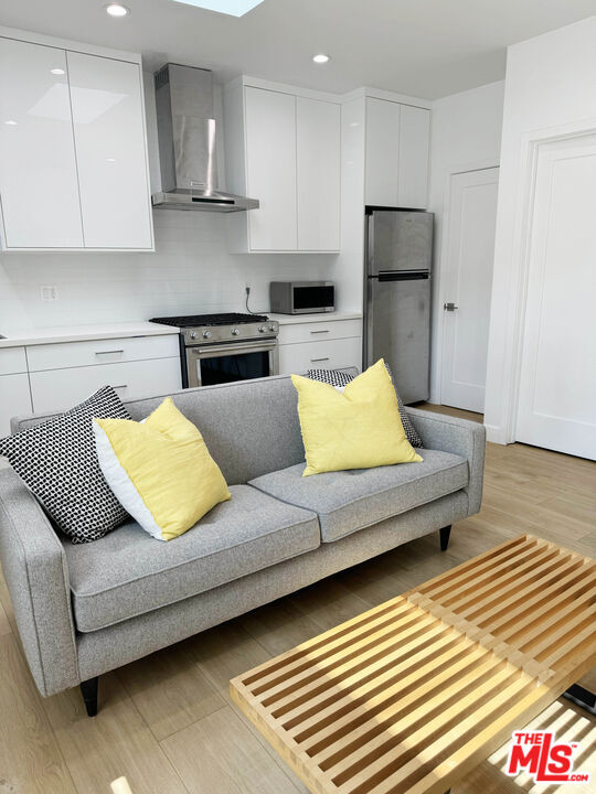 Charming standalone one bedroom apartment built in 2022, offering the privacy and feel of single family living in a quiet Westside residential neighborhood. Approximately 515 s.f. of thoughtfully designed space filled with natural light, featuring skylights in both the living room and bathroom. The modern kitchen is equipped with high end appliances including a Bosch dishwasher, KitchenAid range and hood, stainless steel refrigerator, and microwave. A dedicated in unit laundry room includes a full size washer and dryer. Mini split heating and air conditioning in both the living room and bedroom provide year round comfort. Enjoy a private fenced patio approximately 10 by 13 feet, ideal for outdoor dining or relaxing. Private entrance. Street parking available by permit (from city) at approximately $34 per year. A rare opportunity to enjoy comfort, privacy, and modern finishes in a prime Westside location. Photos are from prior listing in 2024. MLS# 26632485