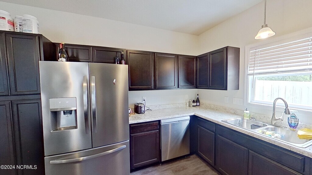 Beautiful two story 3BD/2.5 BA end unit townhouse is located in the Landing at Folkstone in Holly Ridge. The main level features an open floorplan for easy living and entertaining. The living room has access to the covered patio which overlooks the private back yard area. The kitchen offers beautiful wood cabinets, a double sink with window above, lots of counter space for cooking, and a breakfast bar. The stainless-steel refrigerator, dishwasher, built-in microwave and glass cooktop range are included. A half bath and attached oversized one car garage completes the main level. The upper level includes a master suite with an expansive, walk-in closet and private bath with double sink vanity and step-in shower with 2 showerheads. Two guest bedrooms, an additional full bath and laundry closet, ready for your own washer and dryer, are also on the upper level. Close to area beaches of Topsail, shopping in Surf City and Sneads Ferry, and a short drive to bases in Jacksonville. We are an Equal Housing Opportunity Management Company and abide by the term of the Federal Fair Housing Act. No Smoking, e-cigarettes or vaping. Pets allowed with prior approval and required pet fees. Aggressive breed list may apply. Contact listing agent prior to submitting application. All applicants over 18 years of age are subject to a background check, including criminal, credit, employment verification, and past tenancy.