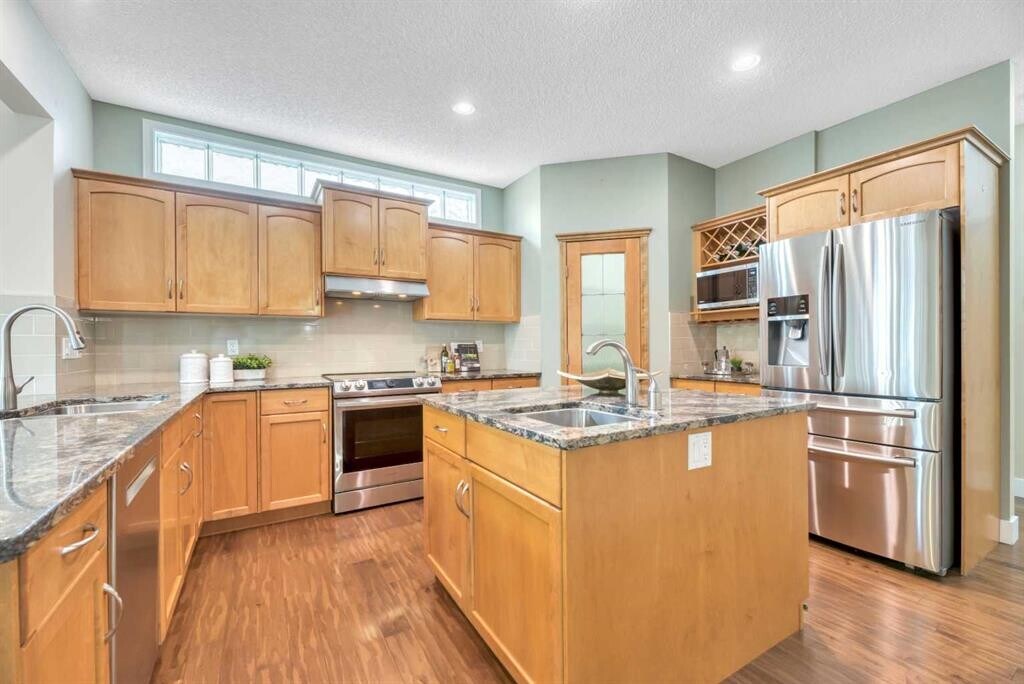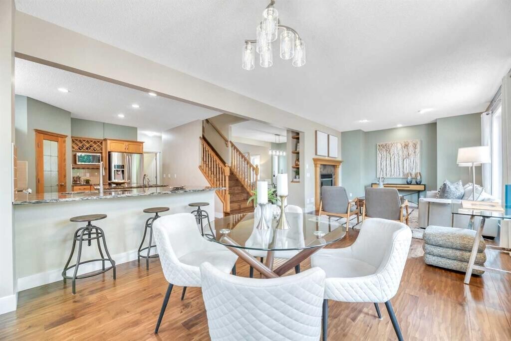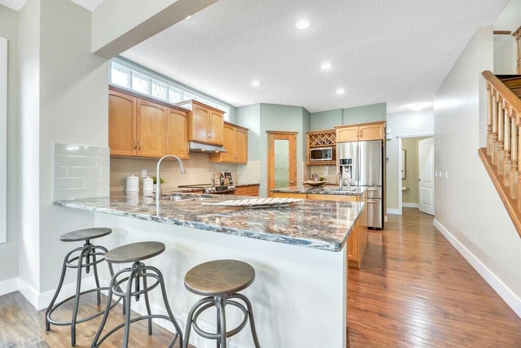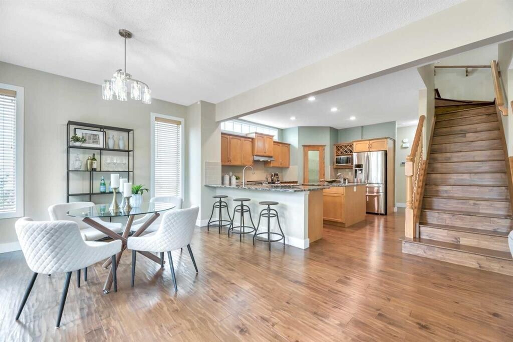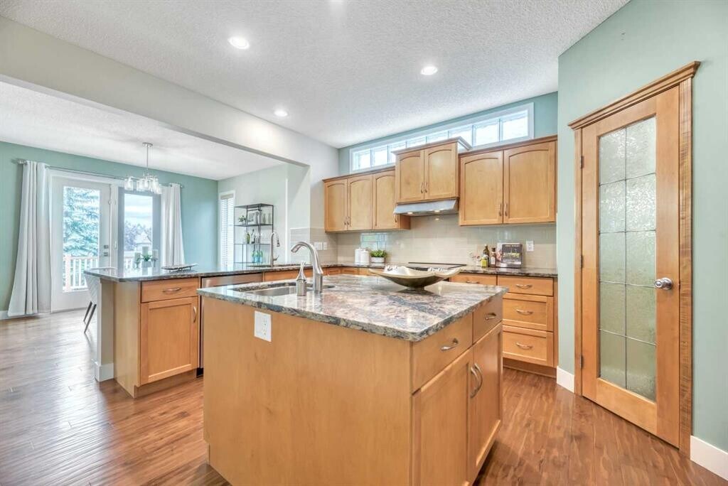 Beautiful Rocky Ridge Retreat – Spacious, Upgraded, and Family-Friendly Nestled at the end of a quiet cul-de-sac in Rocky Ridge, this stunning home sits on a sunny, pie-shaped lot surrounded by mature trees—offering peace, privacy, and room to grow. With nearly 3,500 sq ft of modern, updated living space, this home blends warmth, sophistication, and functionality. Step into a grand foyer with soaring 18-foot ceilings and rich maple hardwood floors. The open-concept layout flows into a chef's dream kitchen featuring quartz countertops, custom cabinetry, premium stainless appliances, and an oversized walk-through pantry. The bright breakfast nook opens onto a multi-tiered cedar deck and a west-facing backyard—perfect for outdoor dining, relaxing, or entertaining. Upstairs offers four spacious bedrooms and a versatile loft ideal for an office or play space. The luxurious primary suite includes a spa-inspired ensuite and a generous walk-in closet. The fully finished basement adds even more flexibility, with a fifth bedroom, a granite wet bar, and ample space for movies, games, or guests. Ideally located minutes from schools, parks, the Rocky Ridge YMCA, LRT, shopping, and major routes—this home is a perfect blend of lifestyle and location. Whether you're hosting family gatherings or enjoying quiet evenings under the sunset, this is a home where lasting memories are made.