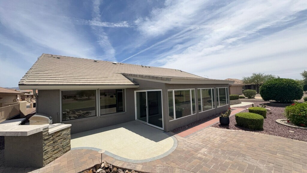 Mountain and golf course views. Enjoy the heated and cooled Arizona room overlooking the golf course, complete with a private water feature and outdoor kitchen. Solar shades provide added efficiency and security. Nice upgrades completed in 2025 include a brand-new roof, two HVAC units plus a mini-split system, and fresh interior paint and new carpet. Master bathroom has a walk in shower and a Bidet. Second bathroom has a step in shower tub. Located in Sunland Springs, enjoy resort-style amenities including golf, pickleball, tennis, a dog park, live entertainment, and more.