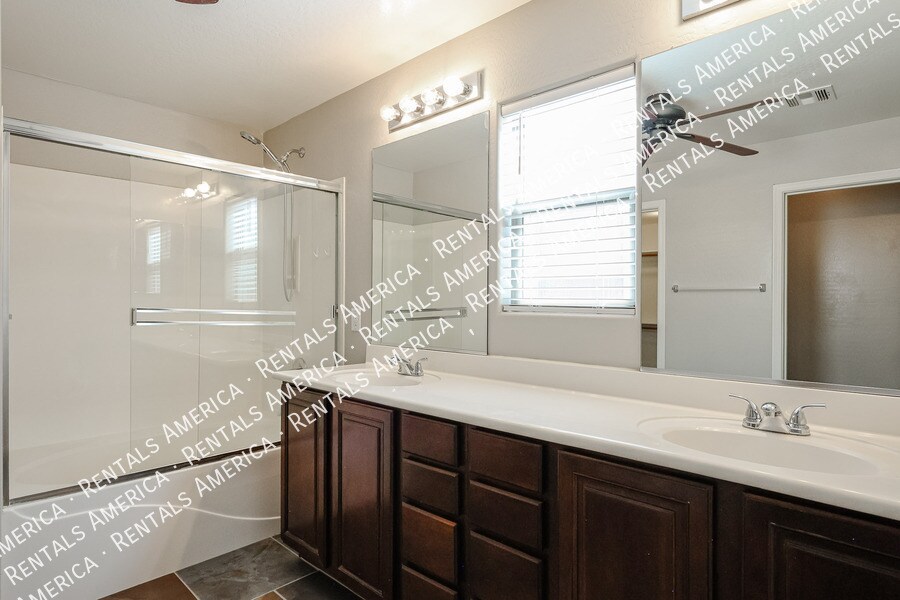 This community has every thing you could want in a master plan. Three heated pools, clubhouse, many closeby playgrounds, greenbelts and sport courts. This home is beautifully designed with one bedroom and full bathroom on the first level. Second level features two guest bedrooms, guest bathroom and primary suite, which includes walk-in closet, double sink vanity, bathtub and private toilet room. Upstairs laundry room with washer and dryer included. Kitchen has rich maple cabinets, all appliances, built-in microwave, large closet pantry and slate tile. Just off Kitchen is a spacious living and dining room that leads to an attractive back with a covered patio and side space with natural looking turf lawn. Brand new carpet and blinds just installed. Ceiling fans throughout. Home is situated directly across from a large open park. Close to SanTan Village Mall, Topgolf and Outdoor Activities. You will love this Move-In Ready Home! Open to a multi-year lease. Sorry, No Cats One Time Admin Fee: $300, Pet Deposit: $300/pet (if applicable), Service Fee: 2%. $39/month Resident Benefits Package, Helping Heroes Discount Available! Carpet Community Pool Disposal Dogs Allowed Dryer Garage Pets Allowed Washer