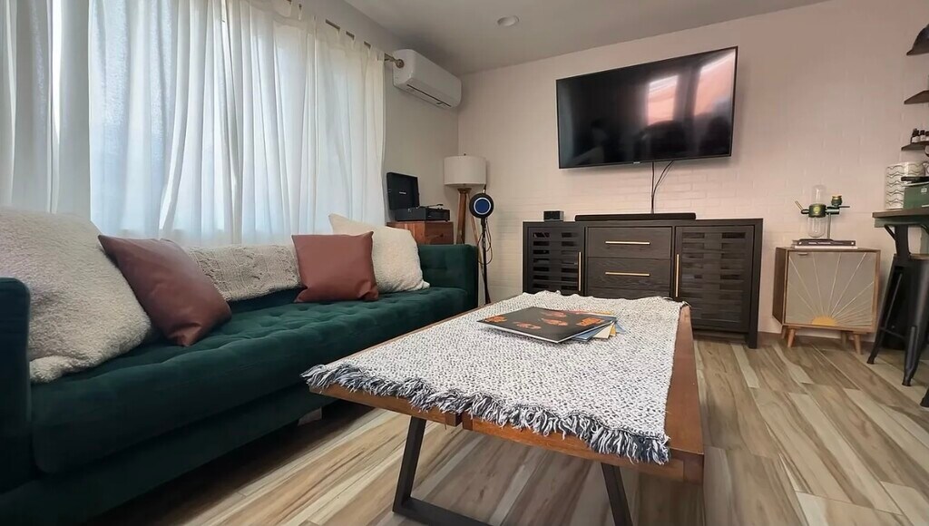 Welcome to this beautifully updated back house, offering 2 bedrooms and 1 bath. This unit is inviting with modern Pinterest-style details throughout. The open living area features recessed lighting, skylight windows, and curtain attachments already in place for the main window, plus an adjustable TV mount ready for use to easily view your favorite shows. The kitchen is thoughtfully designed with modern cabinetry, open shelving, and a stainless-steel refrigerator and stove. There is ample counter space with a bar top, perfect for dining and entertaining. Both bedrooms are bright and inviting, each with its own skylight and generous closet space with built-in cabinets and an individual A/C system. The master bedroom features a sliding glass door that opens directly to the backyard perfect for enjoying morning sunlight or evening relaxation. The chic bathroom features a spacious walk-in shower and contemporary finishes. Overall, this home delivers modern comfort, thoughtful upgrades, and a warm, stylish atmosphere. Washer and Dryer unit included for extra convenience! Outside, the property includes a private patio offering a calm and comfortable sanctuary. Pets are welcome, allowing pet owners to enjoy the company of their furry friends. The property is close to Dominguez Elementary School, Rancho Dominguez Preparatory High School, and the 710, 91, and 405 Freeways. Furniture not included.