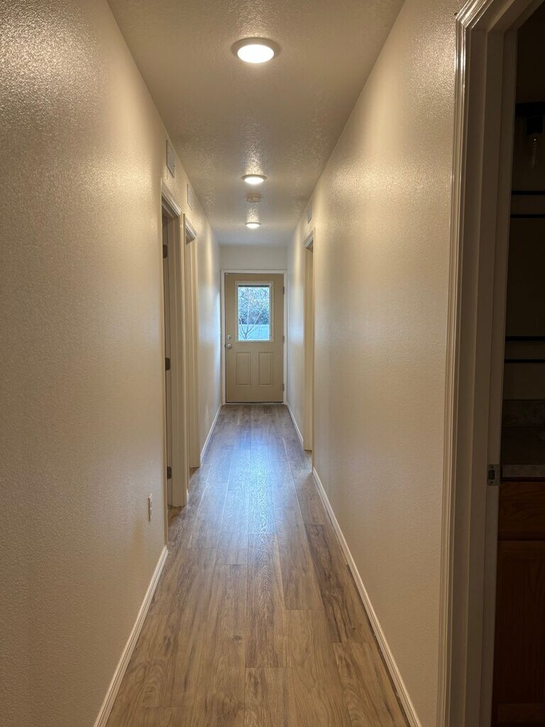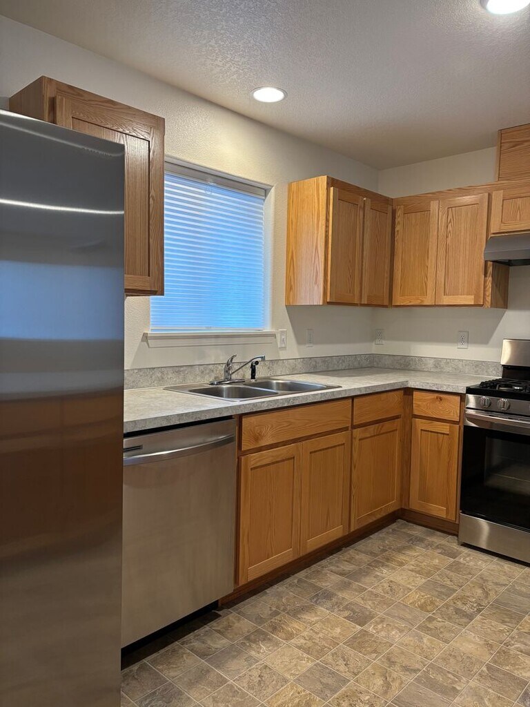 Newer Single level home. Three bedrooms, 2 full baths, 1357sf, 2 car attached garage. Cadet heating with a mini split for heat and AC in the living room, and a hybrid water heater. LVP flooring with carpet in the bedrooms. Eat in kitchen with a refrigerator, gas range/oven, dishwasher, garbage disposal and pantry. Master Bath had a large stall shower with a single sink and the hall bath has a shower tub combo and single sink. Low maintenance front and backyards. Backyard is fully fenced with a deck for entertaining, raised garden beds, a timed watering system, and Peach and Apple trees. Washer and Gas Dryer included. Pets OK