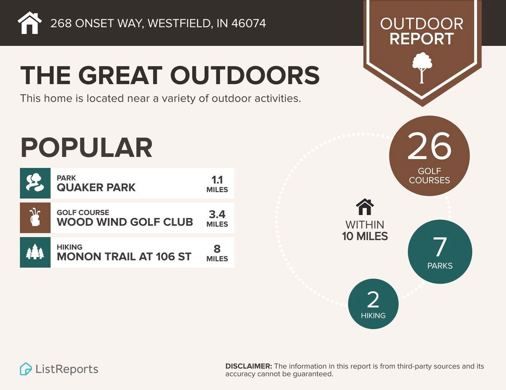 268 Onset Wy has 2 parks within 11.9 miles, including Caribbean Cove, and Climb Time Indy.
