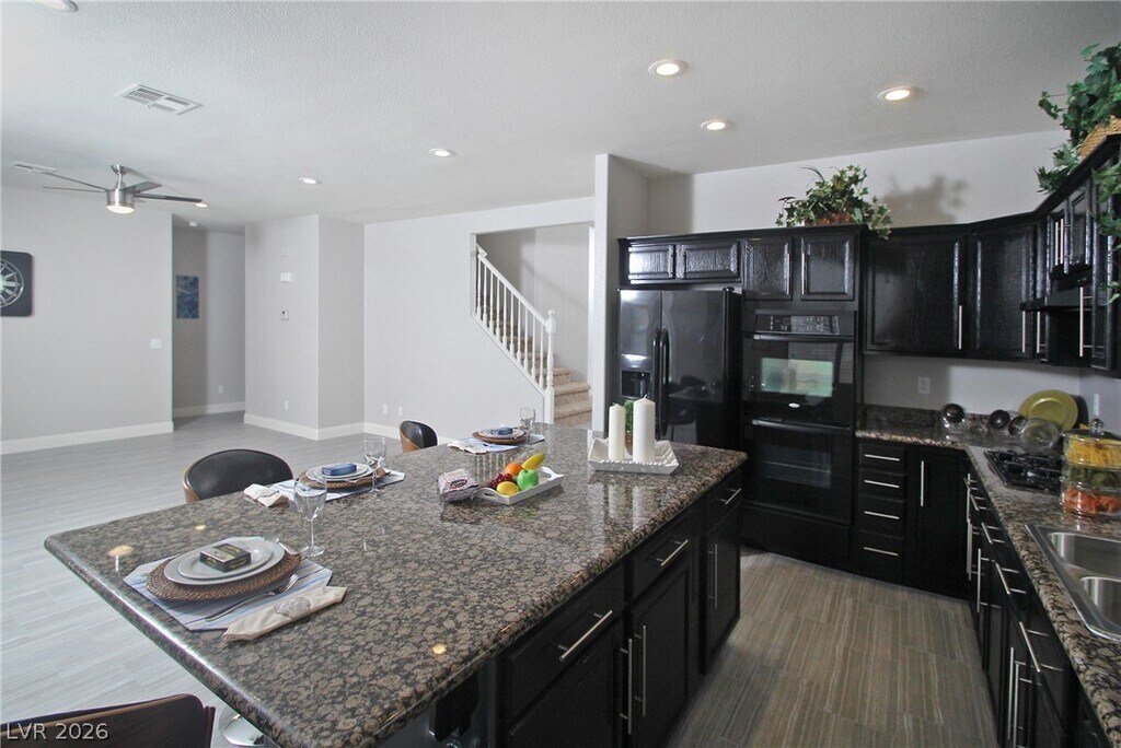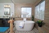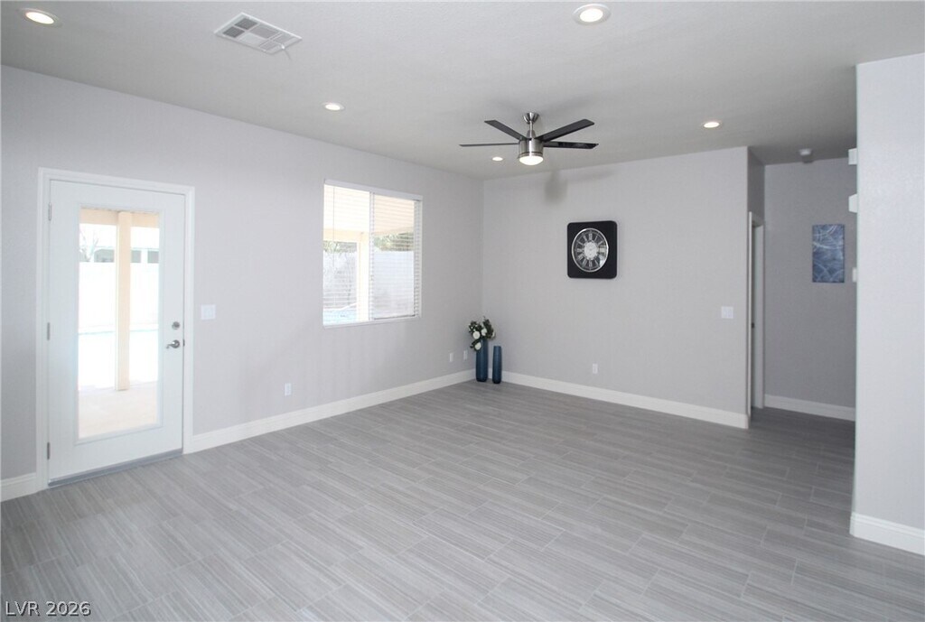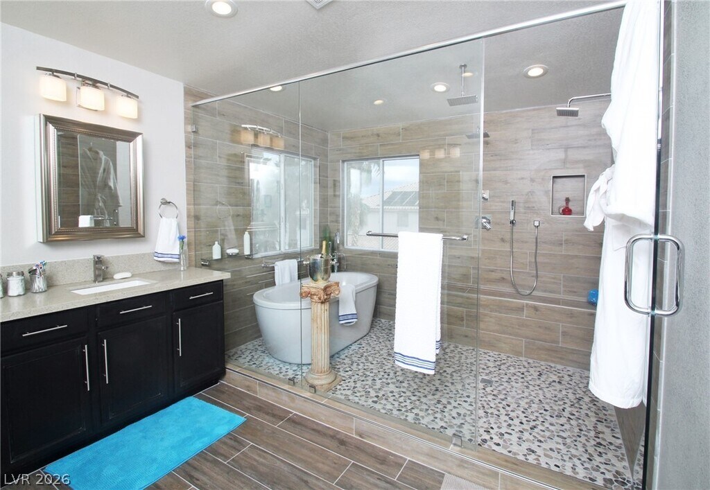 Completely remodeled contemporary home with a pool, located in a gated Henderson community. This stunning residence offers 4 spacious bedrooms, a loft, and a 3-car garage. The luxurious primary bath is truly one of a kind, featuring a freestanding tub, custom surround, and multiple shower heads. Wood-look tile flooring, new bathroom cabinetry and fixtures, and custom recessed LED lighting elevate the home throughout. The granite island kitchen includes all appliances. Enjoy outdoor living under the covered rear patio, plus a storage shed and epoxy-finished garage floors. Bedroom conveniently located downstairs. Pool service included.