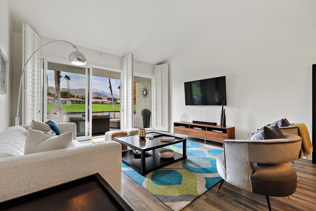 VIEWS,VIEWS,VIEWS! From the second you step inside,you'll see why this home stands out--featuring some of the most incredible views in Rancho Las Palmas. This beautifully furnished rental offers an easy,elevated desert lifestyle with everything ready for immediate enjoyment. Designed with comfort and flow in mind,this 2-bedroom,2-bath home includes an open living area plus an additional space that's perfect for entertaining,working from home,or simply relaxing. The kitchen has a fresh,modern look with quartz countertops,sleek cabinetry,and stainless steel appliances. The layout is ideal for privacy,with bedrooms situated on opposite sides of the home--perfect for guests or shared living. The primary suite includes dual sinks and an updated walk-in shower for a clean,contemporary feel. Out back,the patio is where this home really shines. Enjoy sweeping mountain and golf course views,multiple seating areas,and a fire feature that makes it perfect for both quiet evenings and entertaining. Living here also means access to Rancho Las Palmas Country Club,with amenities that include a 27-hole golf course,tennis facilities,multiple pools and spas,and a full fitness center. Turnkey furnished and ready to go--just move in and start enjoying the desert lifestyle. MLS # 219146358