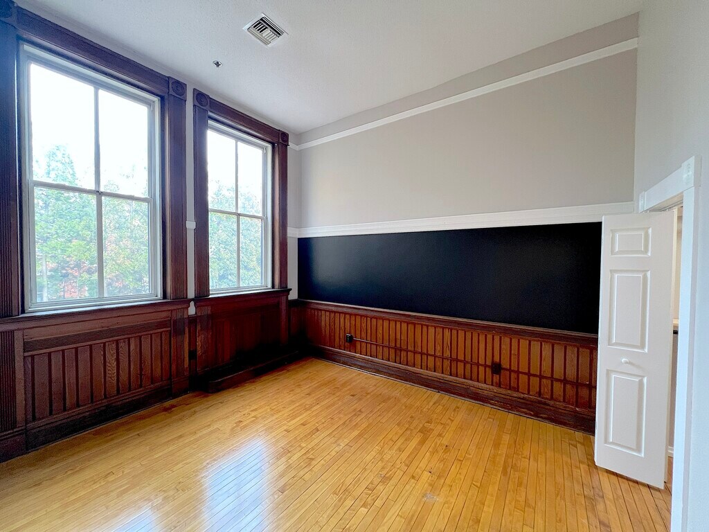 Call for Availability - Gorgeous 1,426 sf 2-bedroom, 1 bath in 1882 school house building! Second floor main level with elevator access. Lofty 12+ foot ceilings throughout. Soft-close kitchen cabinets/drawers, subway tile backsplash, stainless steel appliances, including built-in microwave & dishwasher. Leathered granite countertops, with breakfast bar for two stools overlooking kitchen & living room. Dark green & marble vanity in bathroom. Original refinished hardwood floors throughout, massive wood doors and ornate moldings. In-unit laundry with machines provided. Tons of closet space. Original massive french pocket doors can be used to separate living room from kitchen area. Gas heat and central A/C. 1 Reserved parking space, plus additional visitor parking. Secured building with package locker in lobby. Steps to Downtown, Five Churches Brewery, Walnut Hill Park, Library, & Museum of Art. No smoking, no pets, no eviction or criminal history. On-site landlord. MLS# 24139899