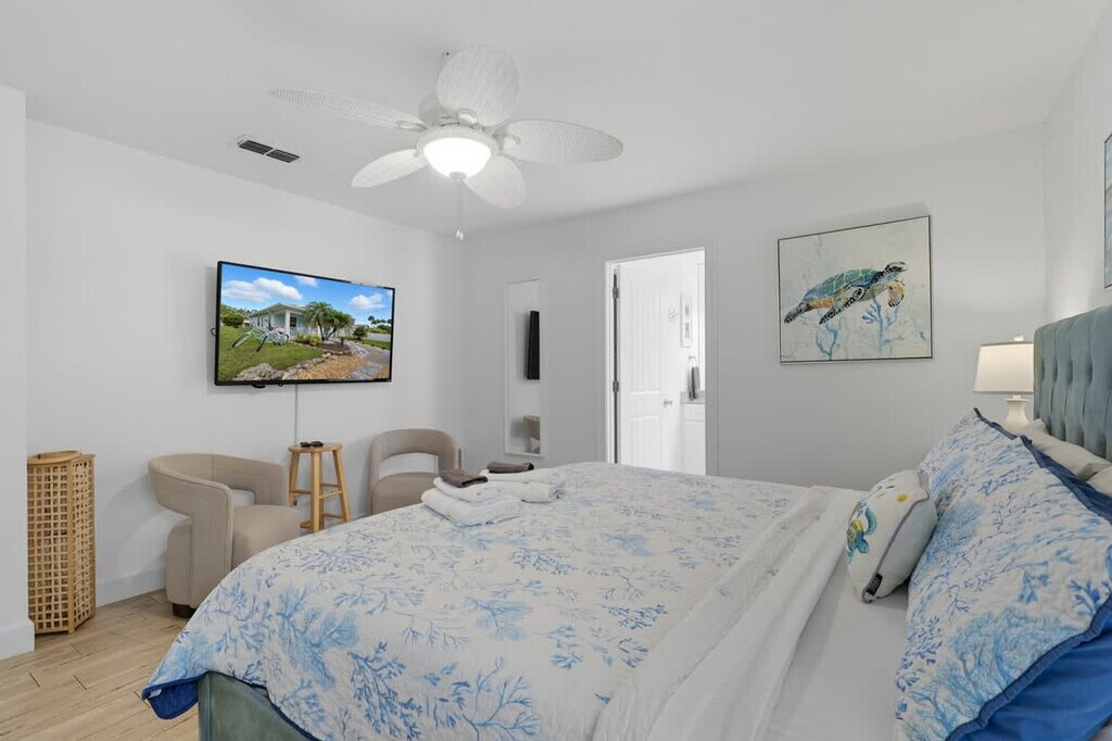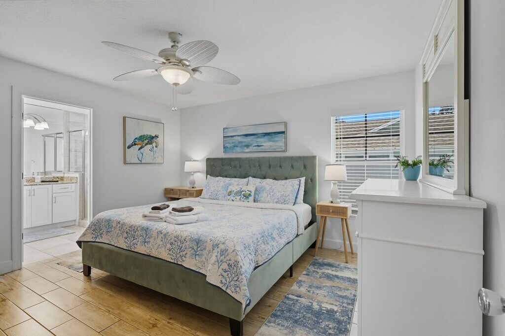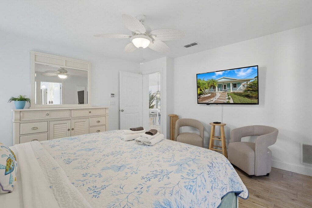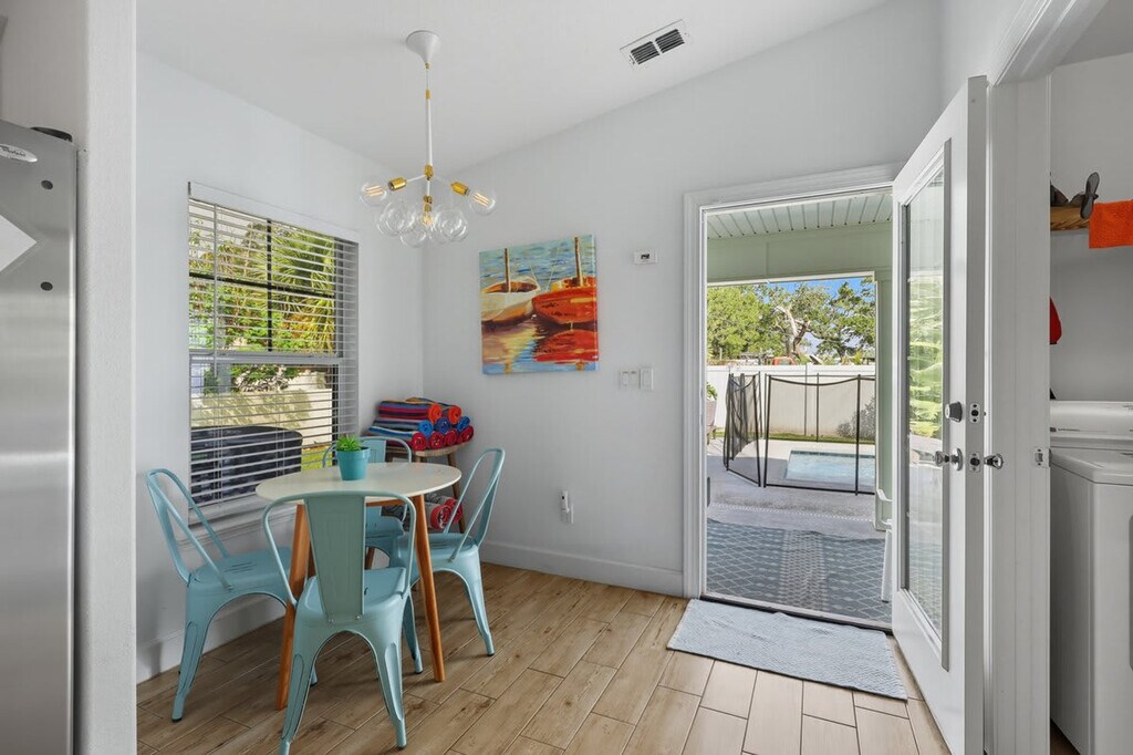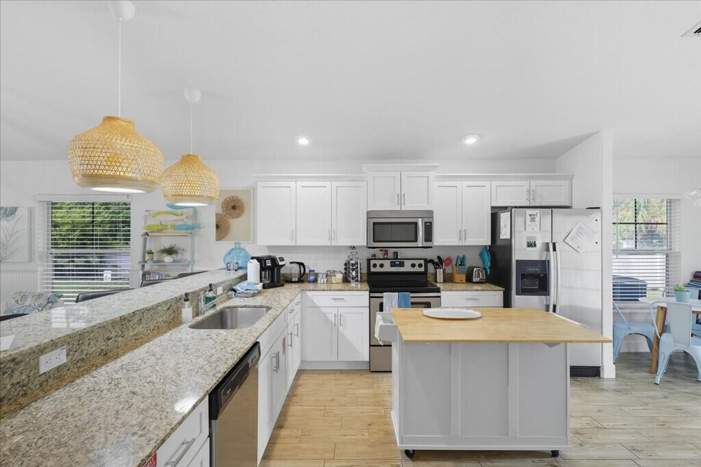 Alina PekarskyCozy and newly renovated 3 bedroom, 2 bathroom home with completely fenced front & back yard with new heated in ground pool located in the unique oceanside community of Malacompra @ Hammock in Palm Coast. This charming home is nestled amongst the old oaks, and is located short walking, biking or golf carting distance to the beach and almost across the street from Bing's Landing state park & boat launch. Besides a beautiful sandy beach, there are miles Bike Trails and a park down the road as well as children play ground, basketball, valley ball, pickle ball & tennis courts where you can put your sportsmanship to the test! It is within walking distance to the beach (golf cart is provided for ease of going to the beach) and Bings Landing Marina where you can enjoy fishing, dining, kayaking and launching your boat on the ICW, and more when you are out exploring. You can also bring your RV or Camper there is a parking on the side with electric hook up to 50Amp.Master bedroom has a King Sized bed and in suite master bath. Guest Rooms 1 has a queen sized bed and guest room 2 have 4 twin beds, to sleep 4. This property sleeps 8 people comfortably.