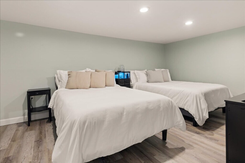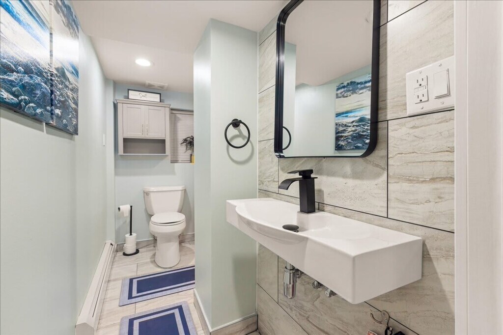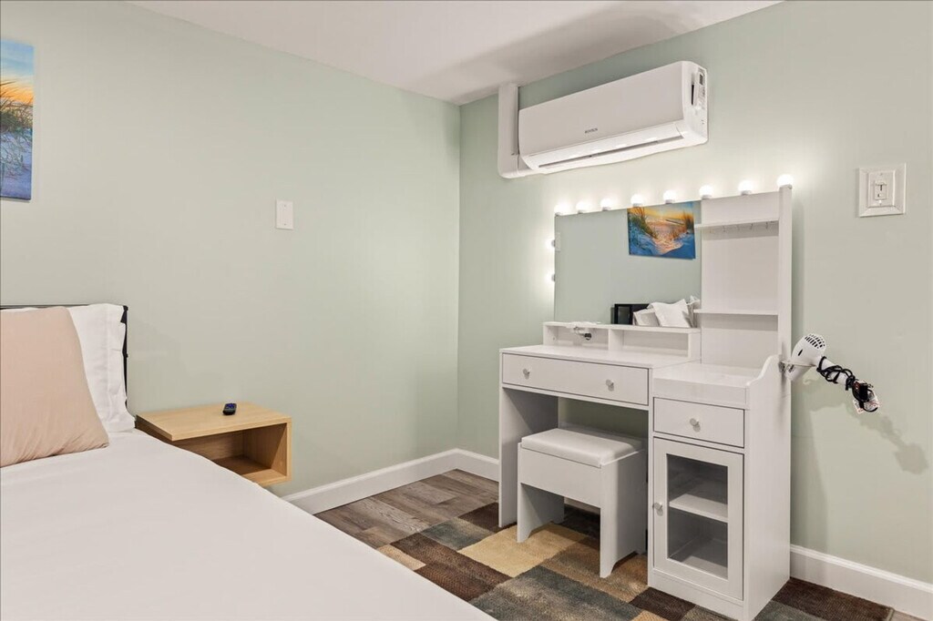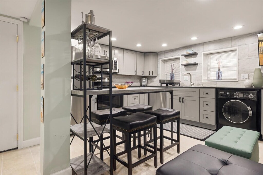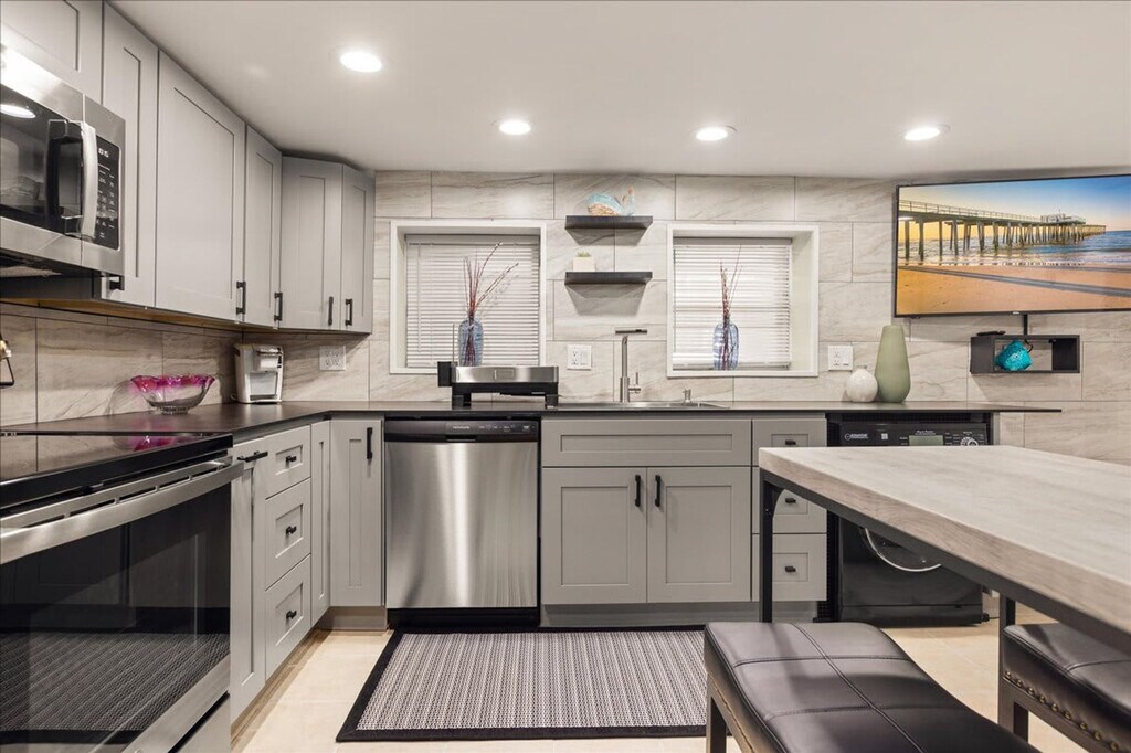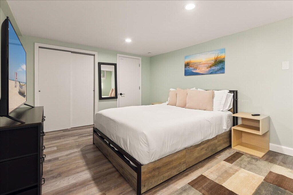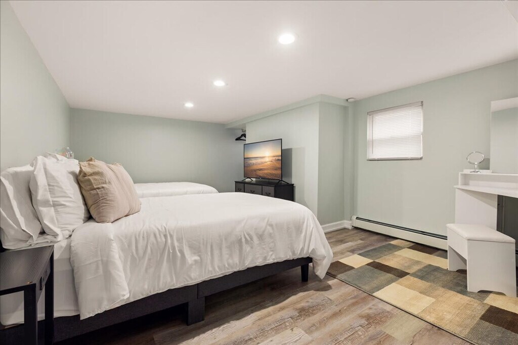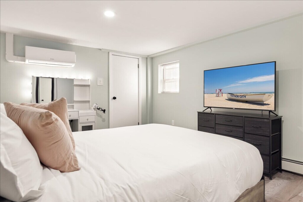 Nestled just steps from the beach, this 2-bedroom, 1-bath garden apartment offers a stylish and comfortable retreat in Ventnor City. Enjoy a fully equipped kitchen with stainless steel appliances, Smart TVs throughout, and a private patio with seating. Additional amenities include in-unit laundry, high-speed WiFi, and an outdoor shower, perfect after a day on the sand. This apartment is ideal for families and friends looking for a modern beach getaway, just a short stroll from the ocean. It features two well-appointed bedrooms with fresh bedding and towels provided, a full bathroom with high-quality bath essentials, and a fully stocked kitchen complete with stainless steel appliances, a coffee maker, and a toaster. The living room includes a sofa bed and Smart TVs throughout. Pets are welcome with an additional pet fee. The apartment also offers a private patio with seating and an outdoor shower shared with the upstairs unit. Located just a 3-minute walk to the beach, this apartment offers easy access to Ventnor City Beach, the Fishing Pier, and the Boardwalk. Nearby attractions include Lucy the Elephant and the Atlantic City Boardwalk. Dining options such as Santucci's Original Square Pizza and Nucky's Kitchen & Speakeasy are just a short walk away. The apartment accommodates a maximum of 8 guests. Smoking indoors is prohibited and will incur a cleaning fee if violated. No parties or events are allowed, and quiet hours are from 11:00 PM to 8:00 AM. Exterior-facing security cameras are on-site for guest security. All guests must upload a valid Photo ID before check-in. The apartment is perfect for remote work with high-speed WiFi available, making it suitable for video calls and other work-from-home needs.