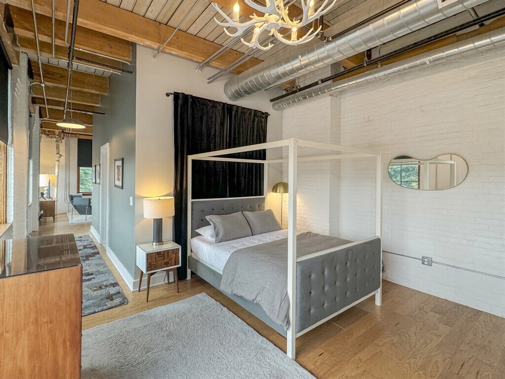 Experience urban sophistication at Joey's Place, a haven of charm on the fourth floor. With an industrial ambiance, an open layout, and expansive windows, this apartment exudes character. Enjoy a European-style kitchen, a chic bedroom with a canopy bed, a cozy velvet sofa, and mid-century furnishings. Convenient off-street parking is available, and the vibrant neighborhood offers boutique shopping and diverse dining options just steps away. The M.B. Shantz Button Manufacturing Factory, circa 1903-1904, is a 39-unit modern loft and townhouse. This unique apartment building in Rochester has everything you might need. Only minutes to downtown Rochester with easy access to the highway, the loft offers downtown living at its best. If you are a short-term or corporate executive looking for an extended stay in something other than the confines of a local hotel room, look no further. Enter the European-style kitchen, boasting concrete counters, hardwood floors, and high-end stainless appliances. The spacious bathroom features a large double concrete vanity and a convenient combo washer and dryer. Indulge in the eclectically designed bedroom, adorned with a canopy bed and original artwork. In the living area, sink into the plush velvet sofa, complemented by cozy mid-century furnishings, which add a touch of luxury, originality, and comfort to your stay. Guests always have access to the fitness center. Off-street parking for one car adds convenience, while the vibrant neighborhood offers boutique shopping and diverse dining options just steps away. Discover the exceptional at Joey's Place, where every detail is designed to elevate your visit to Rochester beyond the ordinary. This unit is entirely independent of other apartments in the building. [SI]