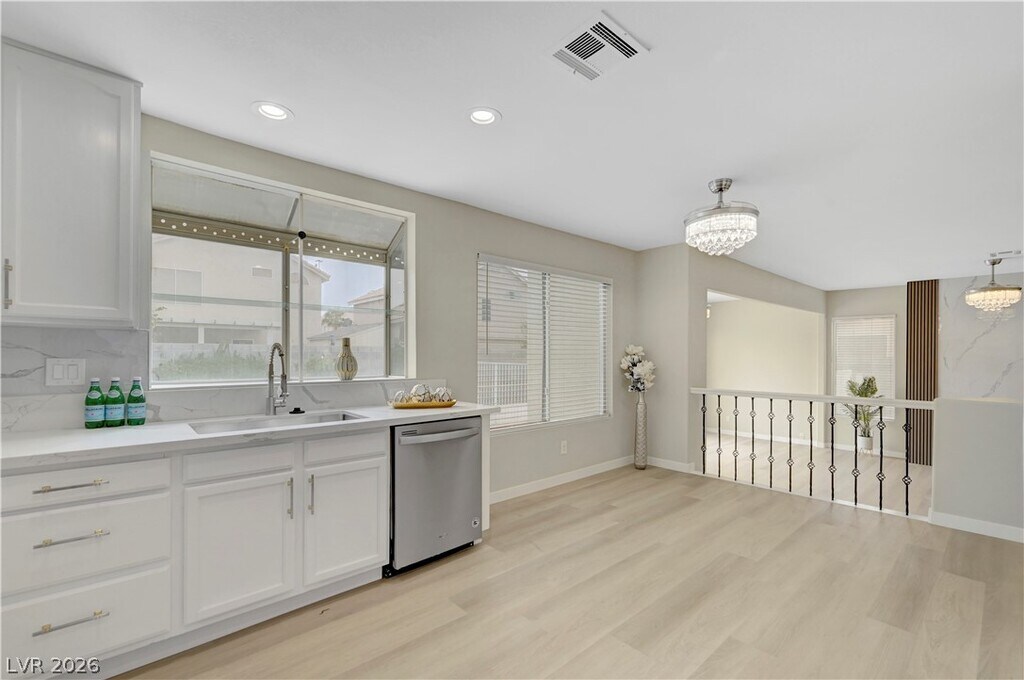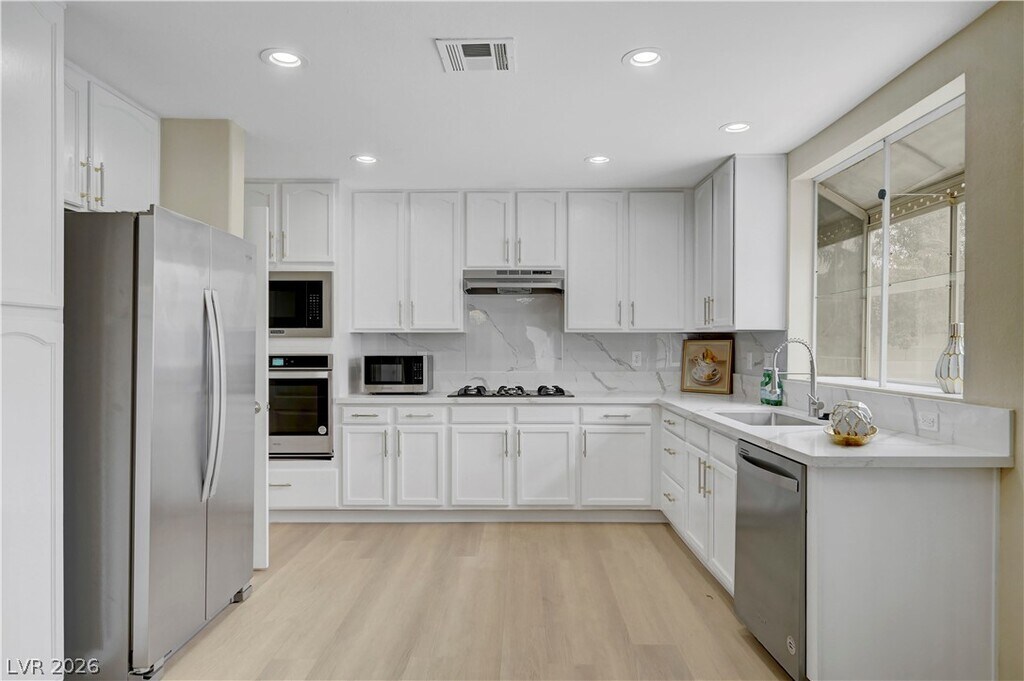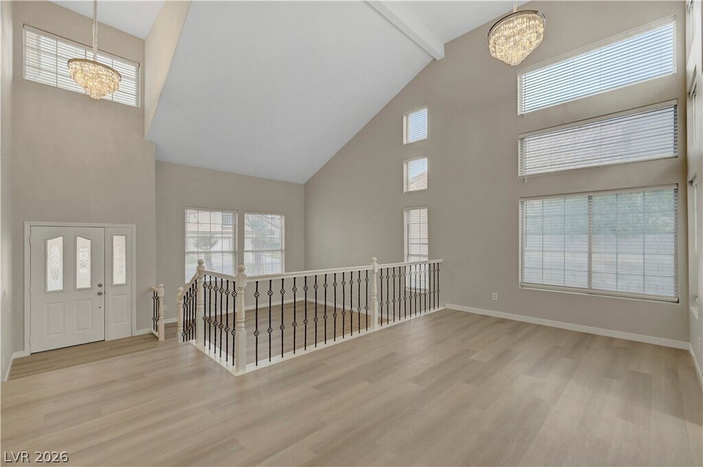 Beautifully remodeled 5 bedroom home with a 3 car garage, pool and spa, ideally located in Henderson! This well-designed floor plan includes 1 bedroom downstairs, perfect for guests or a home office. The home features soaring vaulted ceilings, luxury vinyl plank flooring and ceiling fans throughout, creating a bright and comfortable living environment. The updated kitchen is the heart of the home, showcasing granite countertops, stainless steel appliances, abundant cabinetry and generous counter space! Separate living and family rooms, along with a formal dining room, provide flexible spaces for entertaining and everyday living. Upstairs, the spacious primary suite offers vaulted ceilings, 2 walk-in closets and a bath with dual sinks, a separate shower and soaking tub. Step outside to a private backyard retreat featuring a patio, heated pool and relaxing hot tub—ideal for year-round enjoyment. Located minutes from freeways, schools, shopping, parks, dining, entertainment and more!