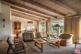A comfortable and spacious single level c. 1965 Mid Century with explosive vistas of Lake Hollywood, the hills, and the sparkling city below! Original detailing throughout makes this home feel so special and of the era like the rocked wall front entry with double doors and original tongue and groove vaulted ceiling and fire place in the living room. The exceptional floor plan offers a broad, southern exposure living room and dining area, with walls of glass and large sliders opening to the grassy yard and covered patio, perfect for days and evenings taking in this very special panorama of nature and city beyond. The kitchen offers lots of space to hang with peninsula and breakfast area. Off the kitchen is a laundry room, full bathroom, and private office, which opens to the patio. The cozy den is a perfect TV room ad features original wet bar. The primary bedroom suite is filled with light and very spacious with dual closets, access to the yard, and original sunken tiled shower plus dual vanities. Three bedrooms, two bathrooms, plus hallway linen closet and storage complete the floor plan. Located on a friendly and quiet street, there is ample parking in addition to the two car direct entry garage. A special home with function, fun vintage detailing, and lots of space for the whole family. Enjoy, entertain an unwind in this exceptional setting in the Hollywood Hills. Minimum 13 month term. Property is available furnished or unfurnished. Tenant pays all utilities. MLS# 25622457
