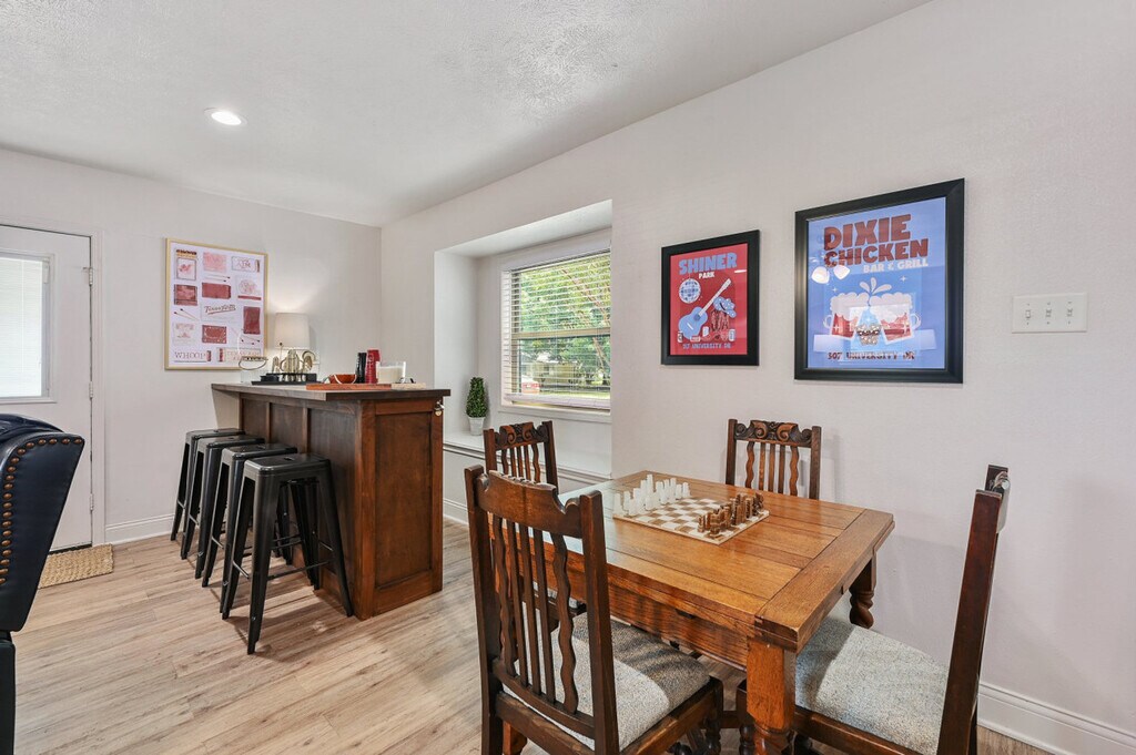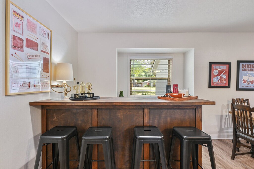 Welcome to the Good Bull Getaway! Feel at home in this inviting 3-bedroom home, located just 4.1 miles from Kyle Field, 4.5 miles from Historic Downtown Bryan, and only 2.5 miles from Travis Bryan Midtown Park. Perfect for families, friends, or passionate Aggie fans, this home combines cozy comfort with the vibrant spirit of Texas A&M, making it the ideal base for your adventures in College Station. This home features a fully equipped kitchen with stainless-steel appliances and an open-concept design that flows into the dining area with seating for the whole group. There is also a formal living area with classic charm, plus a cozy window seat perfect for morning coffee or a quiet reading nook. The remodeled garage has been turned into a game-day lounge with a bar, two large flat-screen TVs, and plush couches. If you wish to have an event at the property, permission must be obtained from the trusted partner and homeowner, and an event fee will be added. Nearby highlights include Kyle Field (4.1 miles), Downtown Bryan (4.5 miles), Travis Bryan Midtown Park (2.5 miles), Messina Hof Winery (12 minutes), and the Northgate District (10 minutes). Smoking is not allowed in or on the property, and if the cleaning crew or booking agent detects any evidence of smoking, $400 will be retained to deodorize the home. Do not turn the thermostat below 69 during the summer as the unit could freeze, and the guest will be charged the cost to repair the heating/cooling system. When leaving in the summer season, turn the thermostat up to 80 degrees. When leaving in the winter season, turn the thermostat down to 60 degrees. People other than those accounted for in the booking agreement may not stay overnight in the property. If unauthorized guests are found to have stayed, a fee of $300 will be retained, plus $25 per person. Pets are not allowed at Goodbull Getaway, and if a pet is found on the property without prior approval, a pet fee will be charged and the booking may be terminated. Parties are prohibited. If feminine products or other products besides toilet paper have been flushed and clog the plumbing system, the guest will be charged the cost of the plumbing repair. Fires are not allowed on the property, and absolutely no candles may be burned in the house or on the property. If the cleaning crew finds that the property has been left excessively dirty, you will be billed for the additional cleaning time at a rate of $50 per hour. No trash or other items may be left on the property or outside the front door. All trash must be bagged when placed in a dumpster, or there will be a $20 charge. Guests shall not disturb, annoy, endanger, or inconvenience neighbors, nor use the premises for any immoral or unlawful act. Should there be security cameras, guests may not alter, tamper with, or access them in any way, and failure to follow this rule will result in charges to the guest for the full amount of the damages caused by such failure. [SI]