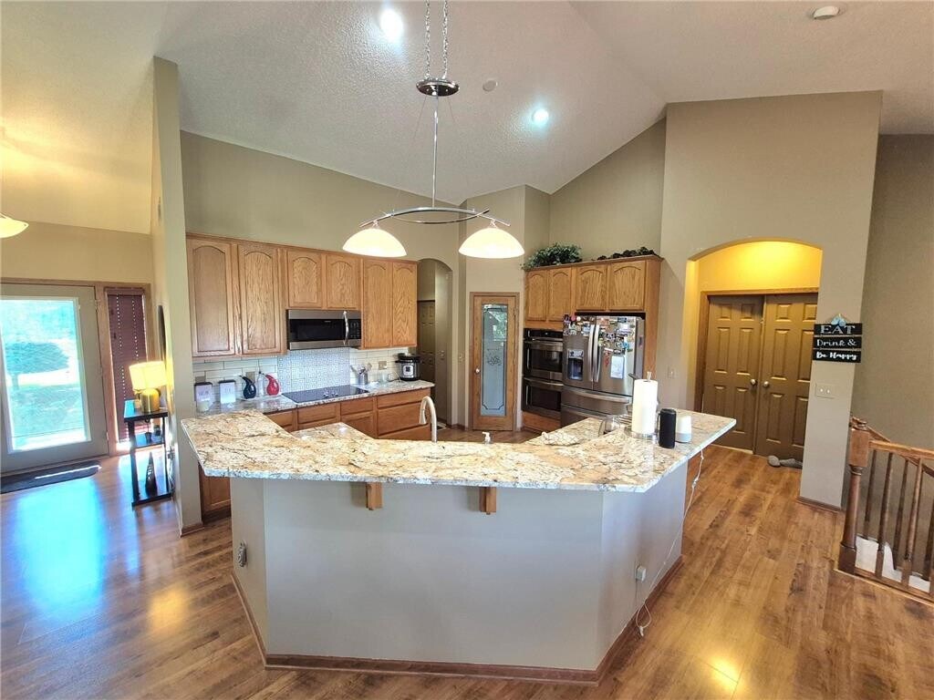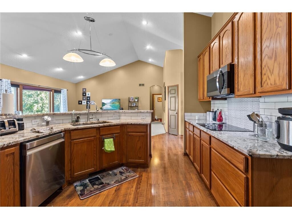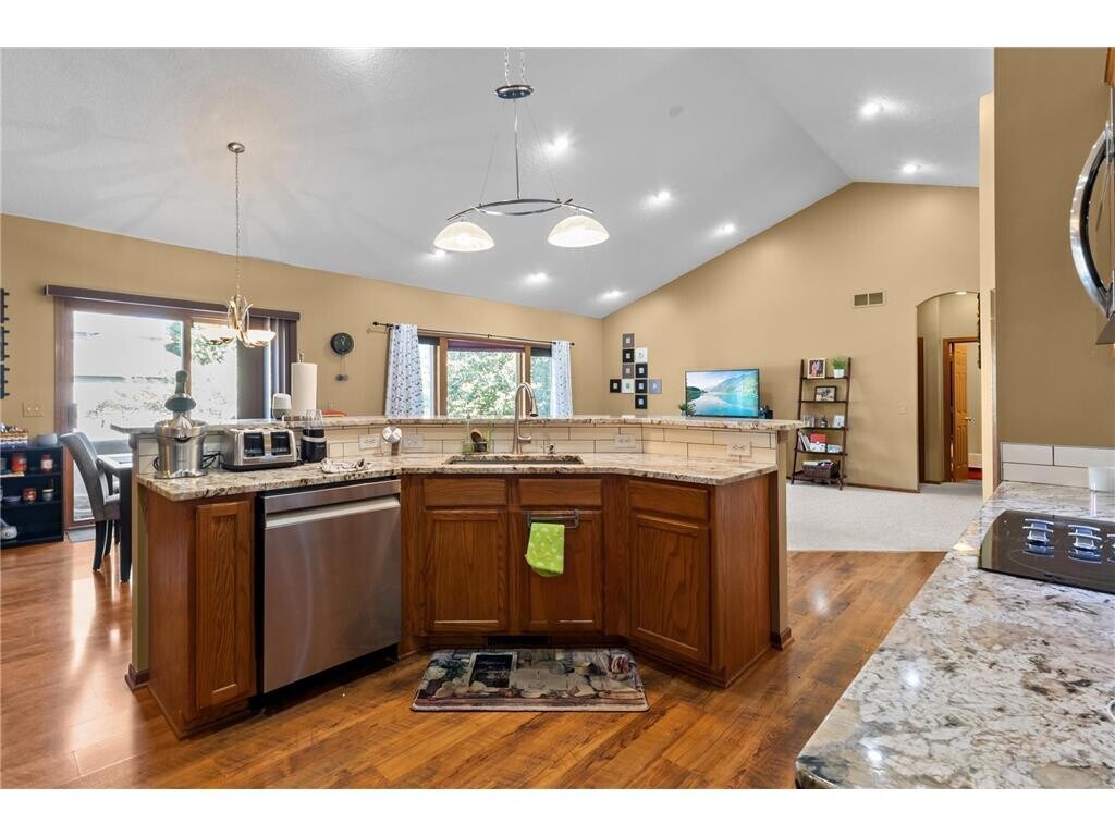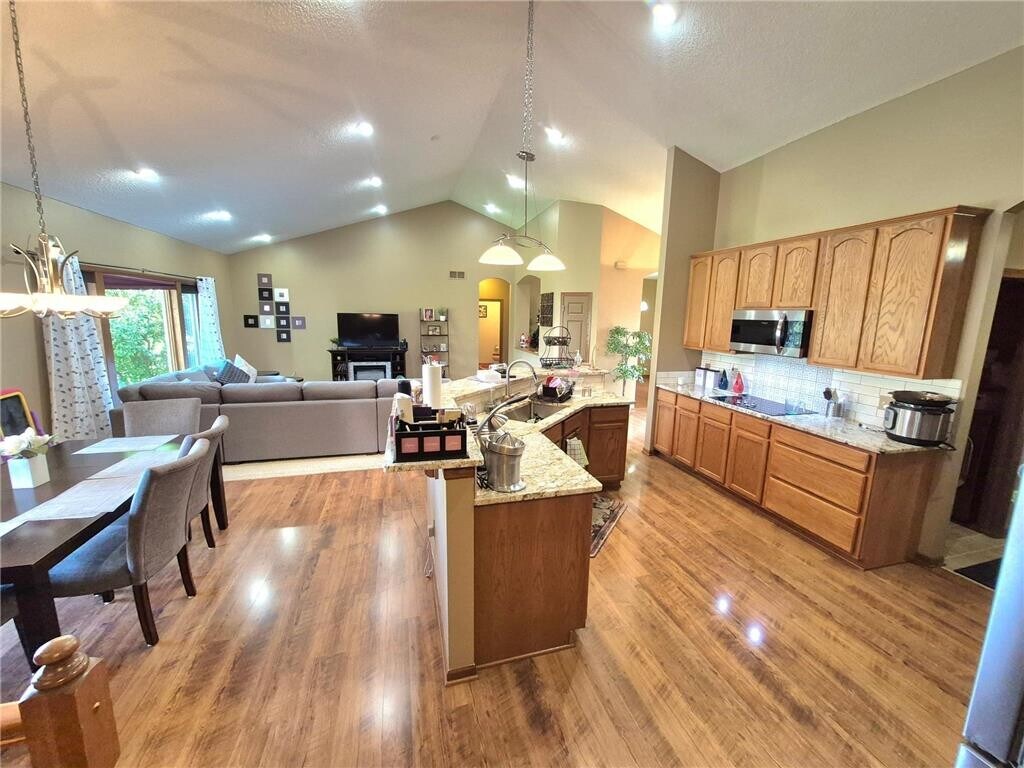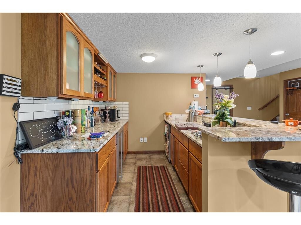 Gorgeous main level living rambler in the Lakes of Radisson Blaine neighborhood with everything! Finished walkout basement, large deck, newer SS appliances, open floor plan, vaulted ceilings, formal dining room, main floor office, granite countertops, back splash, wet bar with fridge and wine cellar, finished three car garage with heater and epoxy flooring, nearly 4,000 finished square feet, exercise/theatre room, large paver patio, huge .35 acre manicured lot, roof and siding replaced five years ago! plenty of trails, parks and lakes, also near the national sports and shopping center.