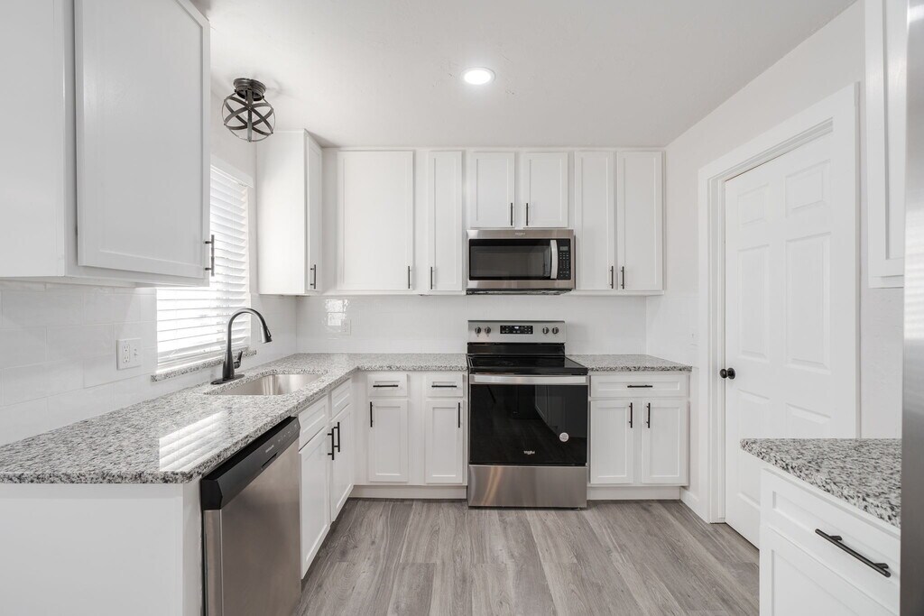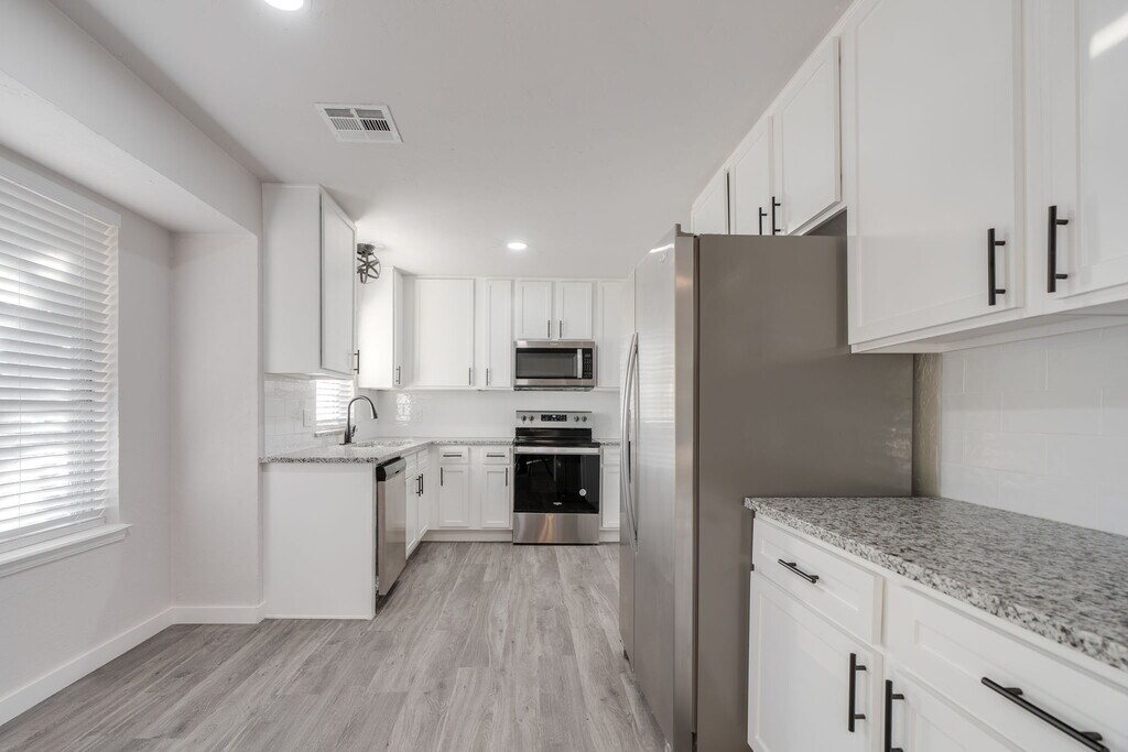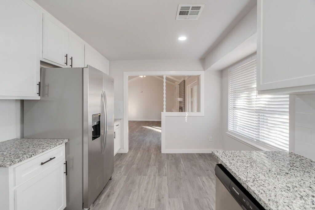 2704 NW 115th St blends classic curb appeal with a fresh, modern interior. Inside, wide-plank LVP floors and neutral paint create a bright, cohesive look from the front living room to the updated kitchen. The kitchen features white shaker cabinetry, granite countertops, tile backsplash, stainless steel appliances, and generous counter space for prep and serving. Bedrooms are comfortably sized with ceiling fans, and the refreshed baths include granite-topped vanities and contemporary fixtures. A two-car garage, double-pane windows with blinds, central HVAC, and a large fenced backyard add everyday convenience. Sliding doors open to the patio for easy indoor-outdoor living. Convenient northwest OKC location near shopping, dining, and major routes—tour today.