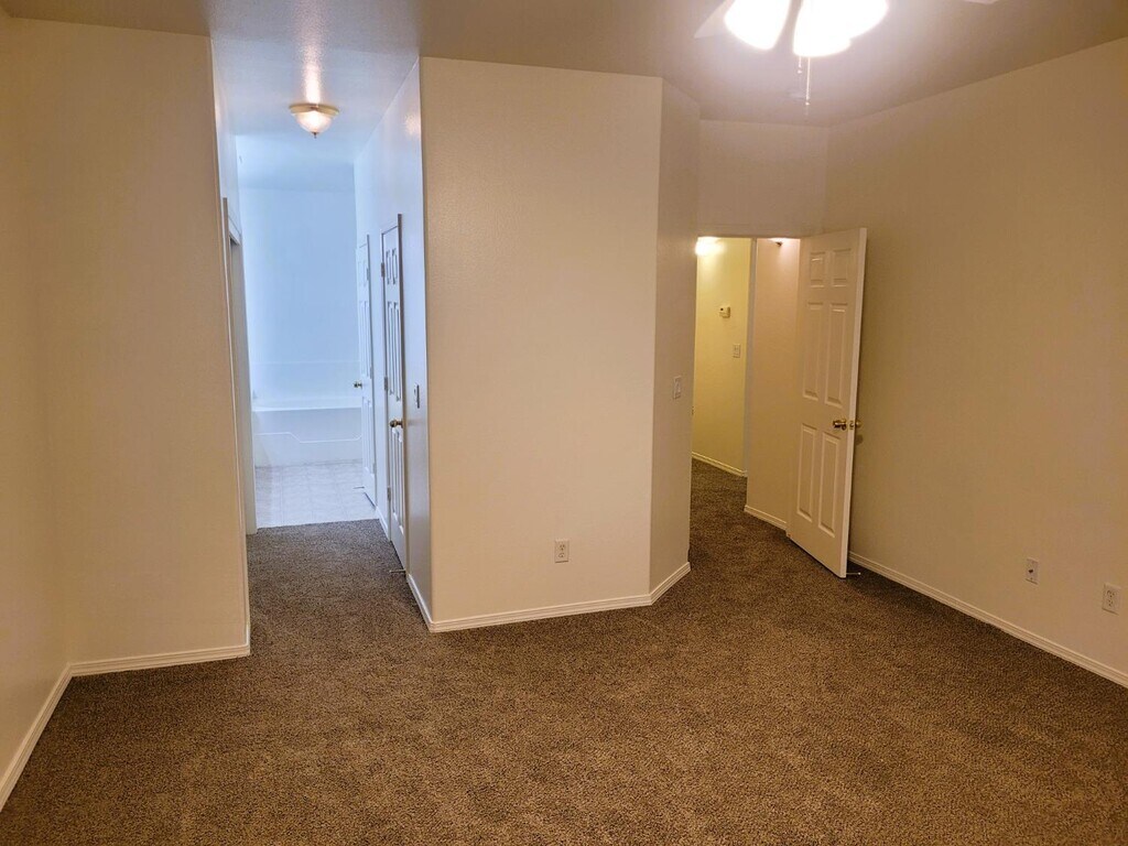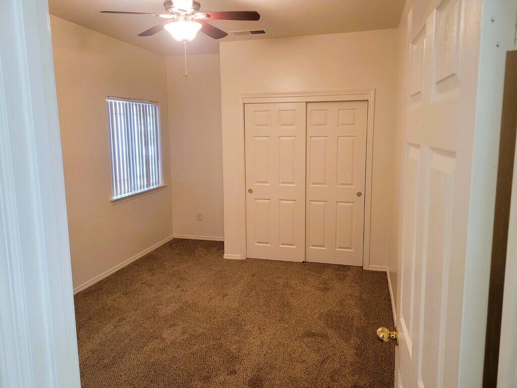 As you step inside, you're welcomed by an inviting open‑concept living room featuring brand‑new carpet, a ceiling fan, and plenty of natural light. The living area flows seamlessly into the kitchen and dining space, creating a comfortable and connected atmosphere. The kitchen includes: a convenient kitchen nook with access to the backyard patio; tile countertops; a gas stove, built‑in microwave, and dishwasher and a pantry for extra storage. Just off the kitchen, you'll find the laundry room, complete with counter space and a sink, which leads directly to the three‑car garage. One of the bedrooms is located near the kitchenideal for guests, an office, or a flexible living space. On the opposite side of the home, a hallway leads to two additional bedrooms, each with large closets and ceiling fans. The guest bathroom features a vanity and a shower/tub combo, along with a nearby linen closet and coat closet for added storage. The primary suite offers generous space, including: a walk‑in closet plus an additional closet with sliding doors; a dual‑vanity sink; step‑in tub and separate standing shower; and fresh paint throughout. Outside, the backyard includes a small covered patio, perfect for relaxing or entertaining.