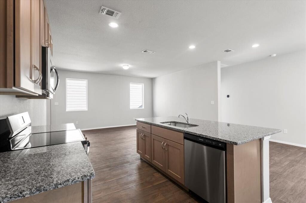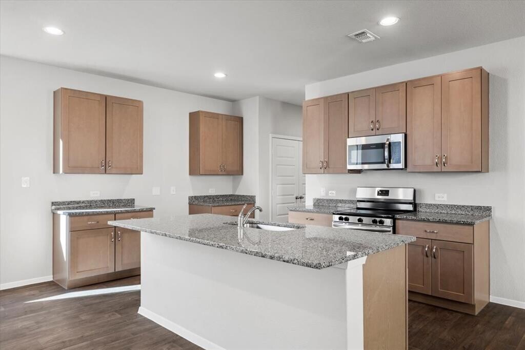 This 5-bedroom, 4-bath two-story home features an open-concept kitchen with Silestone countertops, a spacious living area, and a luxurious owner’s suite with walk-in closet and walk-in shower. Upstairs offers additional bedrooms and a flexible game/media room. The landscaped lot includes automatic sprinklers, and the home sits near trails, parks, and community amenities, with a convenient two-car garage and modern finishes throughout.