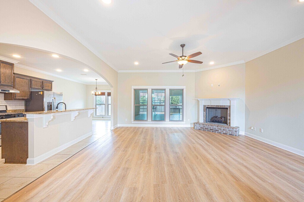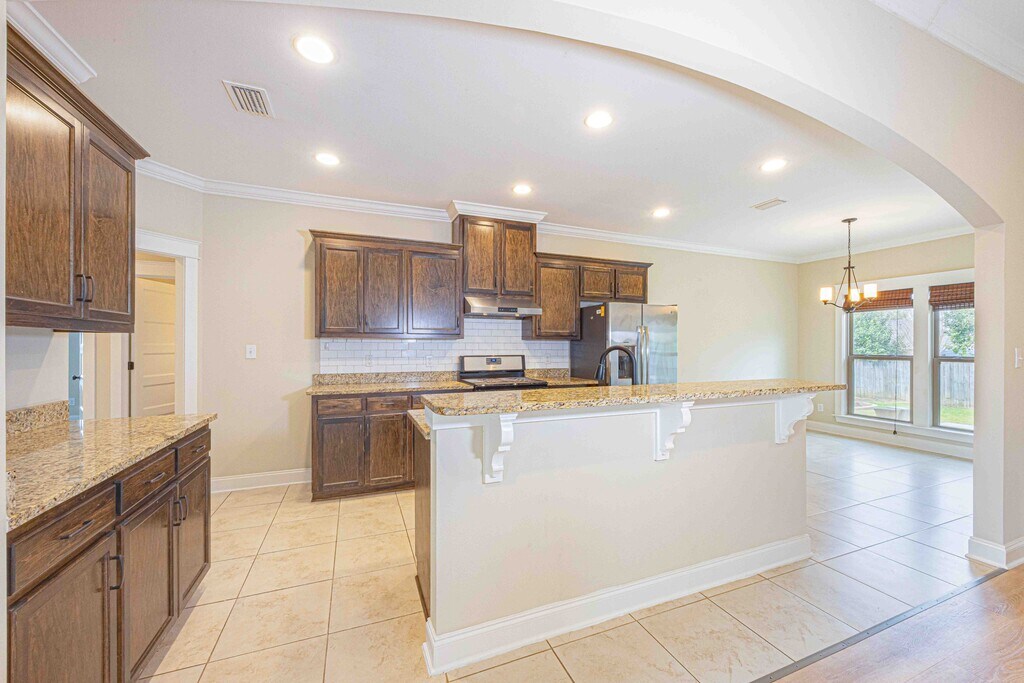 Great four-bedroom, three-bath home located in Daphne and built by Truland Homes! This open and spacious floor plan features a welcoming living room with a cozy fireplace that flows seamlessly into the eat-in kitchen. The kitchen offers granite countertops, a large island with seating, gas range, and generous pantry space. A formal dining area sits just off the living room. The split-bedroom layout includes a spacious primary suite with tray ceiling, and a primary en-suite featuring a walk-in shower, garden tub, and double vanity. Three additional bedrooms and two full bathrooms provide plenty of space for family or guests. Enjoy the fully fenced backyard with back patio and sunroom—ideal for relaxing or outdoor gatherings. Home also has storage shed. No Pets.