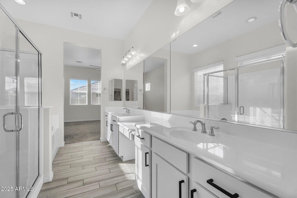 Popular split floor plan offers 3BR/3BA + den/office that could be converted to a 4th BR. Tandem garage w/ NEW epoxy flooring. Entry opens to a spacious great room w/ upgraded wood-look tile,NEW interior paint & NEW carpet & lots of natural light. Open kitchen features granite counters,shaker cabinets,SS appliances,gas range,lg center island w/ breakfast bar,tile backsplash & walk-in pantry. Private primary suite includes dual sinks,sep tub & shower,& walk-in closet. Low-maintenance backyard is made for relaxing w/ cov'd patio,extended travertine pavers,synthetic turf & easy-care landscaping. Enjoy Mulberry's resort-style amenities incl comm pools,clubhouse,sport courts,playgrounds,greenbelts & tree-lined streets. Convenient location near shopping,dining,& freeways.