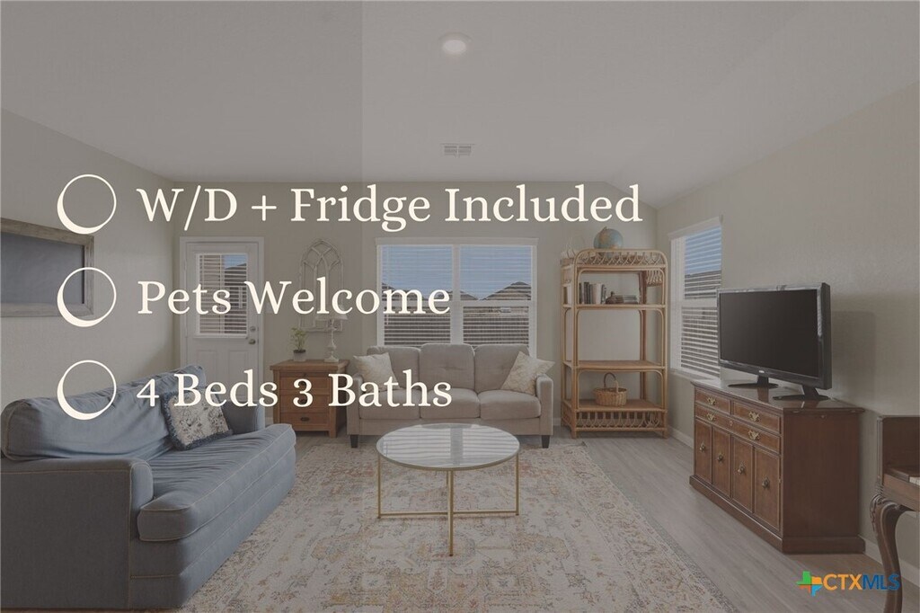 Pre-leased – Available June 1st! Fridge,Washer & Dryer Included. Beautifully maintained 4-bedroom,3-bathroom home built in 2022 with 1,910 sq ft and a smart single-story layout. Three bedrooms are located at the front of the home,while the private primary suite sits in the back for added privacy. The open-concept living area connects the family room,dining space,and kitchen,creating a bright and comfortable space for everyday living. The kitchen features a large island,ample counter space,and a walk-in pantry. The primary suite includes a spacious walk-in closet,double vanity,and a large walk-in shower. Enjoy the backyard with a recently added patio slab and newly planted fruit and shade trees. The home is located in a quiet community surrounded by farmland,offering a peaceful setting while still being conveniently located by New Braunfels and Seguin. Community amenities include a neighborhood walking trail and playground. Zoned to Navarro Independent School District. GVEC utilities.