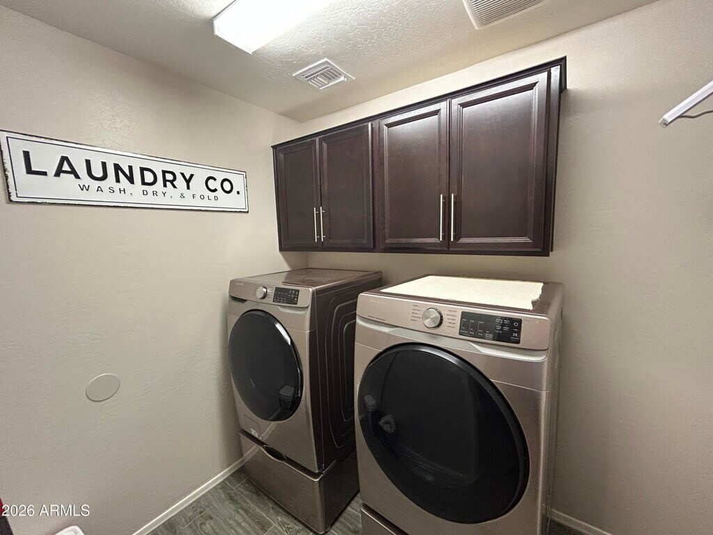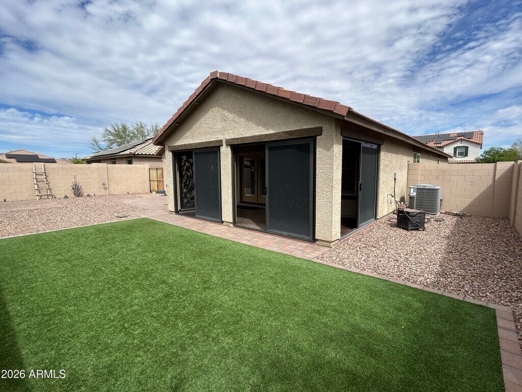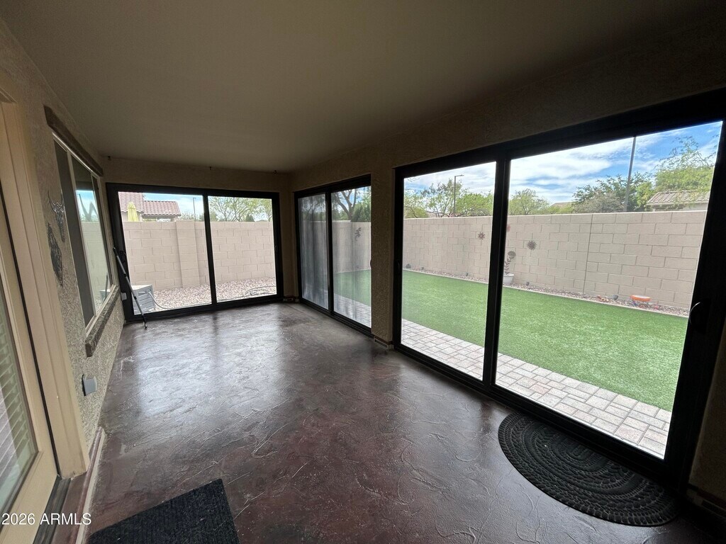 Beautiful 4-bedroom,2-bathroom home located in the desirable Desert Oasis community and ready for immediate move-in. This well-appointed property features wood-look ceramic tile flooring throughout,creating a modern and cohesive feel across the entire home. The kitchen is designed for both style and functionality with quartz countertops,a tile backsplash,and upgraded soft-close cabinets that provide ample storage and a high-end finish. The home offers generously sized bedrooms,providing comfortable living space for everyone. The primary suite includes a spacious walk-in closet and a beautifully designed bathroom with a large walk-in shower. Throughout the home,plantation shutters add elegance while offering privacy and light control. One of the standout features is the enclosed patio with four retractable sliding doors,creating a flexible indoor-outdoor living space that is perfect for relaxing or entertaining. The garage is equally impressive with built-in cabinets for storage and durable epoxy flooring. Additional upgrades include a tankless water heater and a water softener system for added efficiency and comfort. With no neighbors behind the property,you can enjoy extra privacy and open views. Residents of the community also have access to a community pool and a children's playground,making it a great place to live and enjoy the Arizona lifestyle.