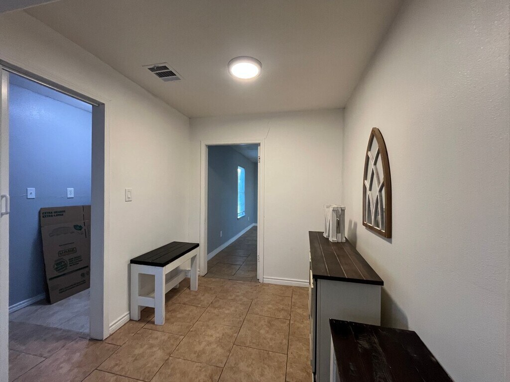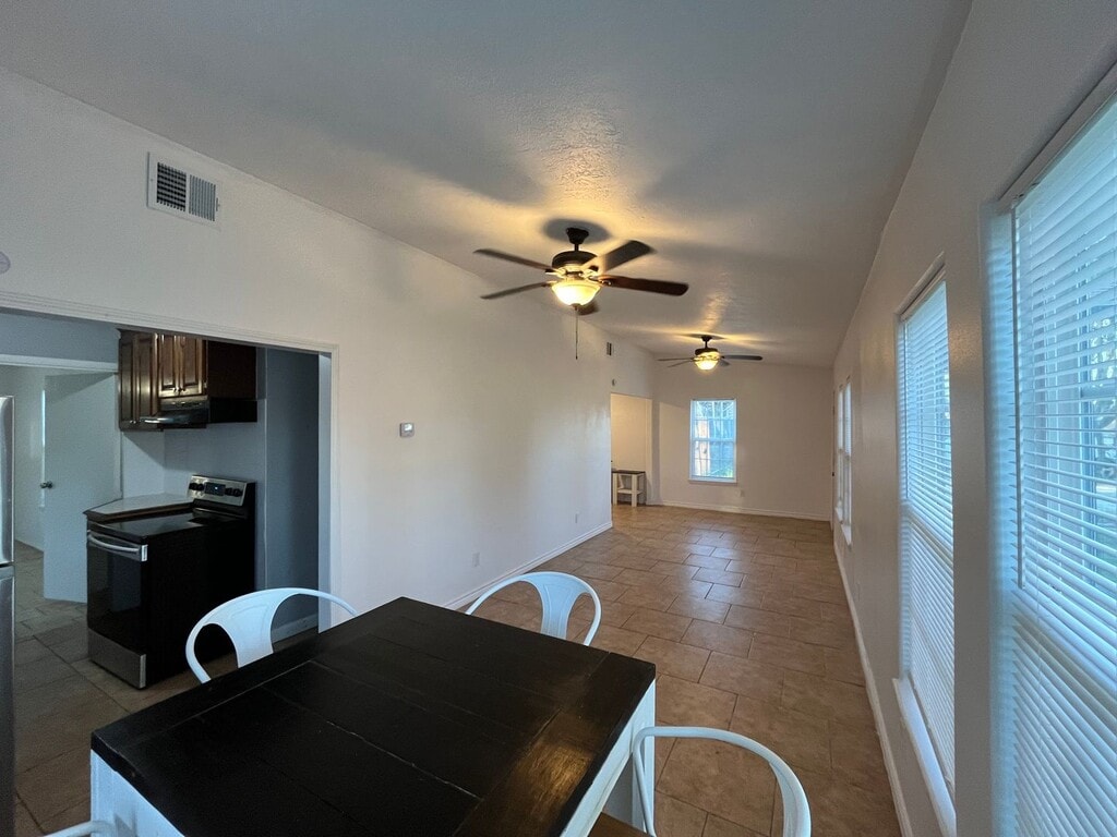 Two bedroom one bath house with WATER AND ELECTRICITY INCLUDED. Tiled throughout! Open your front door to a spacious living and dining room with lots of windows that allow for plenty of natural light to fill the room. Kitchen boasts stainless steel appliances and a double basin sink. Large bathroom with walk in shower leads to laundry area. Split floorplan with both bedrooms tucked away in the back of the house boast ceiling fans and one bedroom provides access to covered patio and fully fenced in backyard.