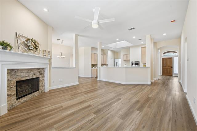 ZONED TO THE HIGHLY SOUGHT AFTER CARROLL ISD. This beautifully updated, split three-bedroom floor plan offers both privacy and flexibility, with a primary suite featuring a beautifully updated en-suite bathroom complete with a walk-in-shower and separate soaking tub. A flex space sits between the two secondary bedrooms, perfect for a home office or playroom. High ceilings create an open, airy feel, while new flooring, ceiling fans, updated fixtures, fresh paint bring a modern charm. The main living area is anchored by a cozy, updated fireplace with gas logs. The kitchen is open to the main living area & breakfast area and features updated appliances, an island & lots of counter space & cabinets. Your utility room has built-in cabinets and a nice sink for when you need it. Enjoy the convenience of being walking distance to Pickering Park and a tranquil community pond with a dock that you can fish from. Plus your just minutes from DFW Airport, shopping and entertainment. Don't miss this exceptional opportunity.