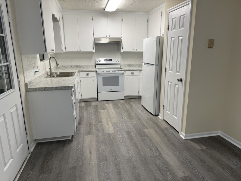This is a two-bedroom, 2-bath duplex with 1,200 square feet. It has been completely remodeled with all-new stove, refrigerator, dishwasher, luxury vinyl flooring, bathroom fixtures, fresh paint, and light fixtures, to name a few. It also includes a drive-in garage.
