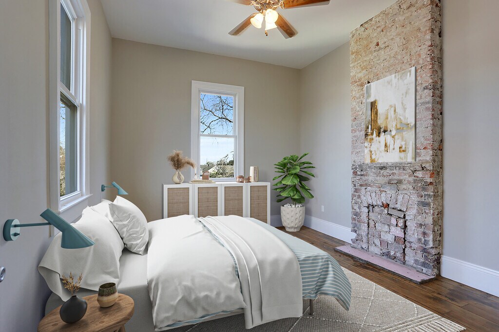 4 beds and 2 baths. 12 foot ceilings with original hardwood floors and fireplaces in all rooms. 3 bed/ 1 bath upstairs; 1 bed/ 1 bath downstairs. Front load washer/dryer included. Fenced in courtyard. Street parking only. yard maintenance provided 2x/month
